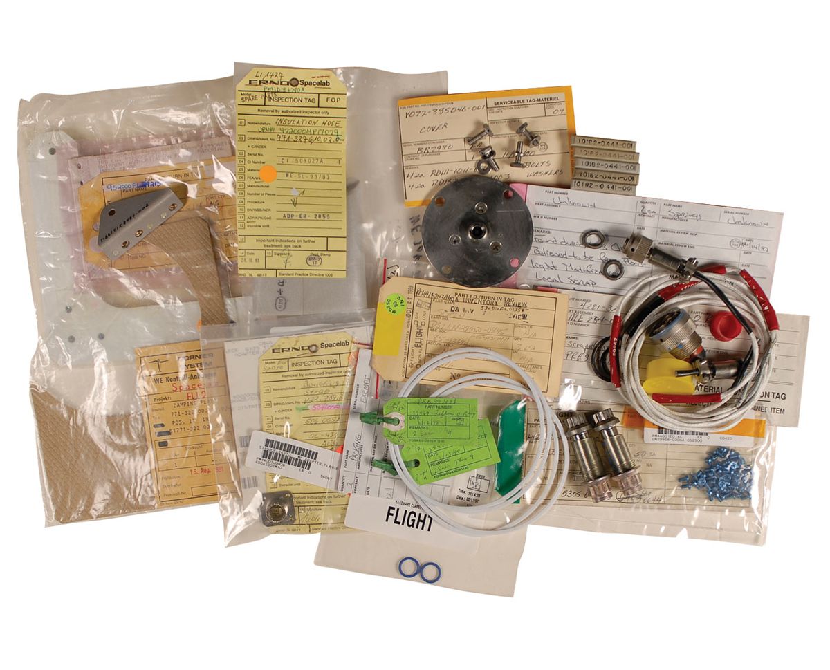 Collection of fifteen parts, many flown, primarily from shuttle missions, with a couple possibly from unmanned missions, and most with parts tags. Items include: four Teflon O-rings, a section of insulation hose, two small O-rings, damping plate from Spacelab, 50 small screws, square flange, bracket, and a metal cover. All parts were originally auctioned off by the Kennedy Space Center.