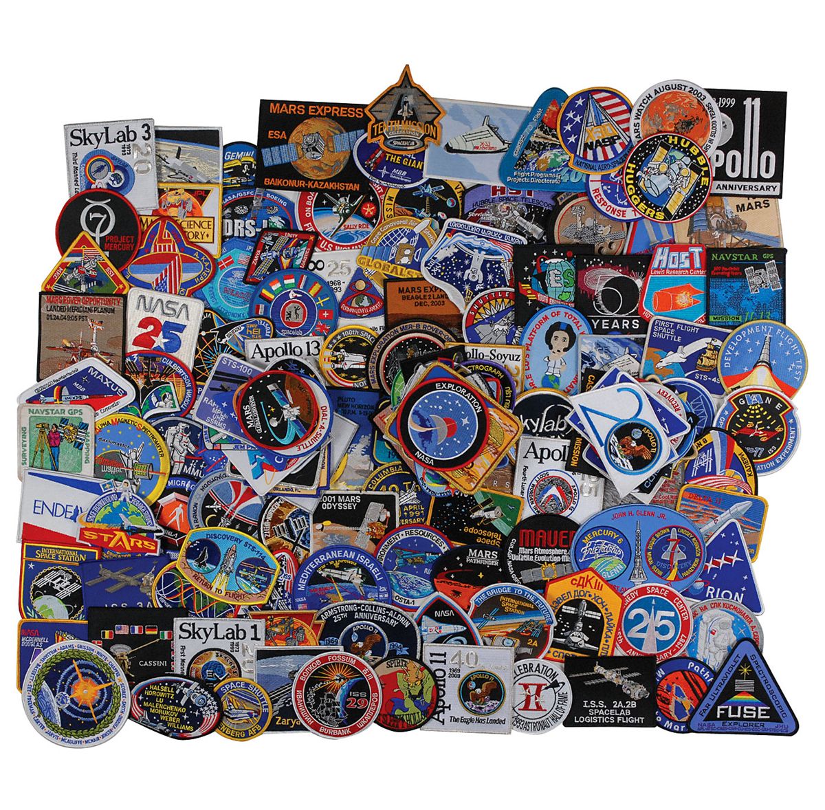 Huge collection of approximately 150 original patches from NASA, aerospace companies, and space contractors. Included are official astronaut prime and support crews, many shuttle payload and flown experiment programs, unmanned launch vehicles, satellites, payload projects, anniversaries, space center installations, Mars-related projects, and more. Highlights include the Dog Crew III in Russian, Apollo 1 and Columbia astronaut-named Martian features, a Kennedy Space Center security-patrol patch, space station crews, and a special John Glenn ‘Oldest Man in Space’ patch from 1998. In overall fine condition.