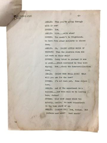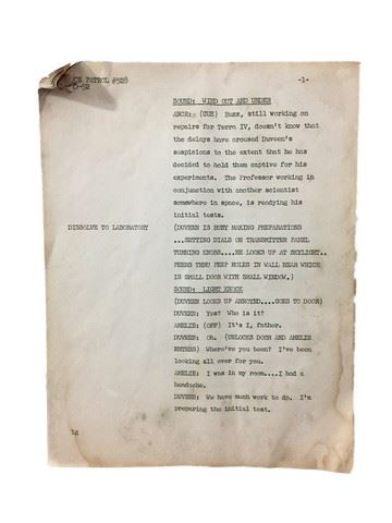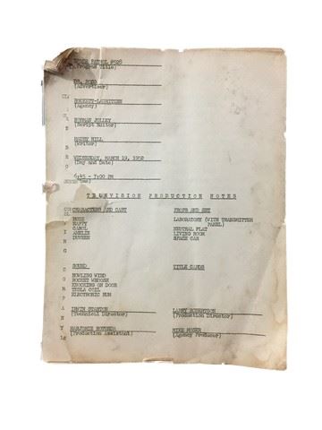 Space Patrol (1950-1955) series episode script with typed production notes. Pages total seventeen, but pictures include the title page, opening sequence description, and first two pages of episode dialogue. Pages have worn edges, tears, creases, paper loss. (8.5"x11").