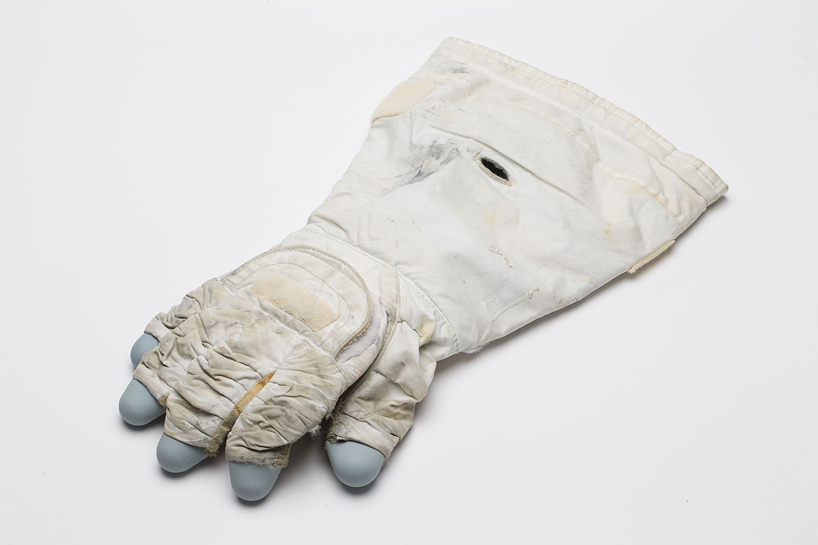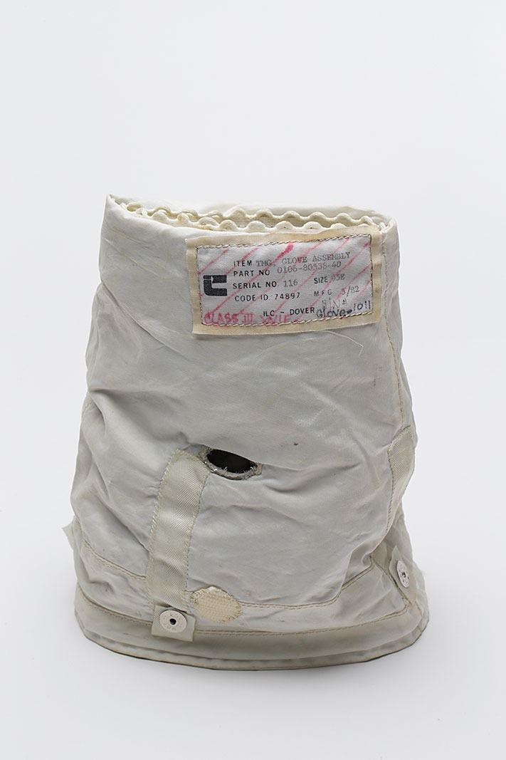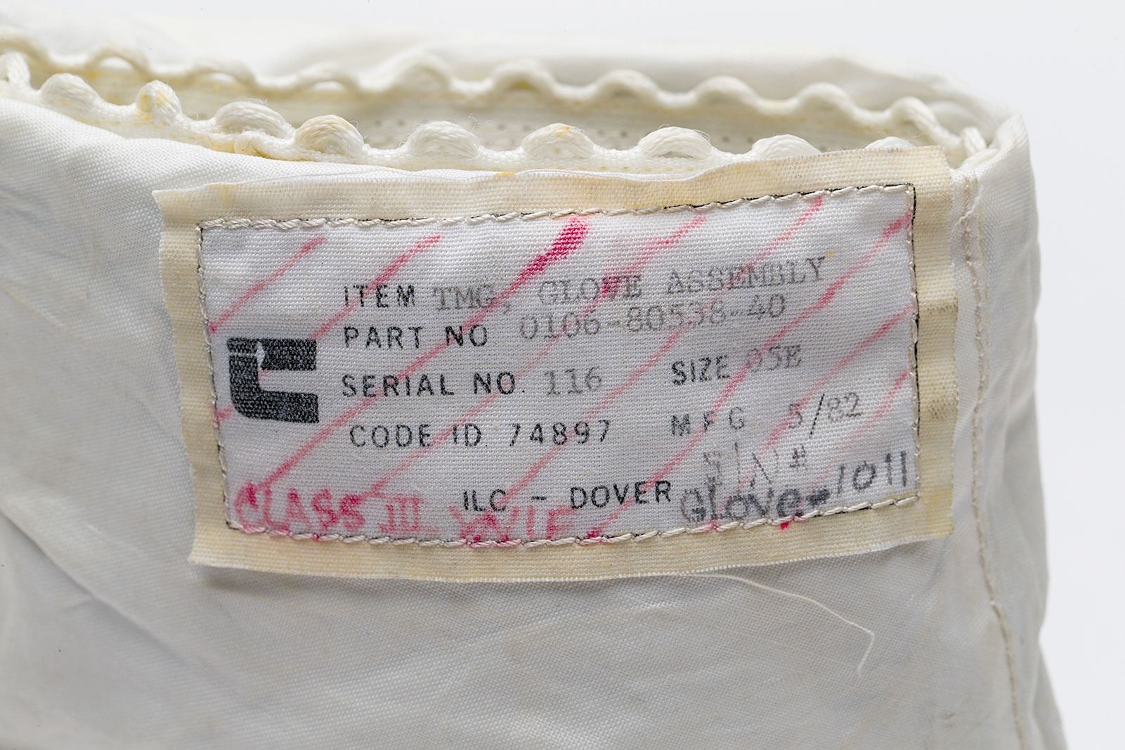 Early 1000 series Space Shuttle glove TMG (Thermal Micrometeoroid Garment), with an ILC-Dover tag on the interior, reading: "Item: TMG, Glove Assembly, Part No. 0106-80538-40, Serial No. 116, Size 05E, Code ID 74897, MFG 5/82." The tag is annotated in felt tip, "Class III WIF" and "Glove #1011." The glove exhibits substantial wear and soiling to the exterior. These early gloves were often flown and then used in the Water Immersion Facility (Neutral Buoyancy Laboratory) for astronaut training. The TMG is the outermost layer of the space suit glove and provides insulation, radiation shielding, and protection from micrometeorites that could otherwise puncture the suit. A desirable, early example of a Space Shuttle glove TMG.