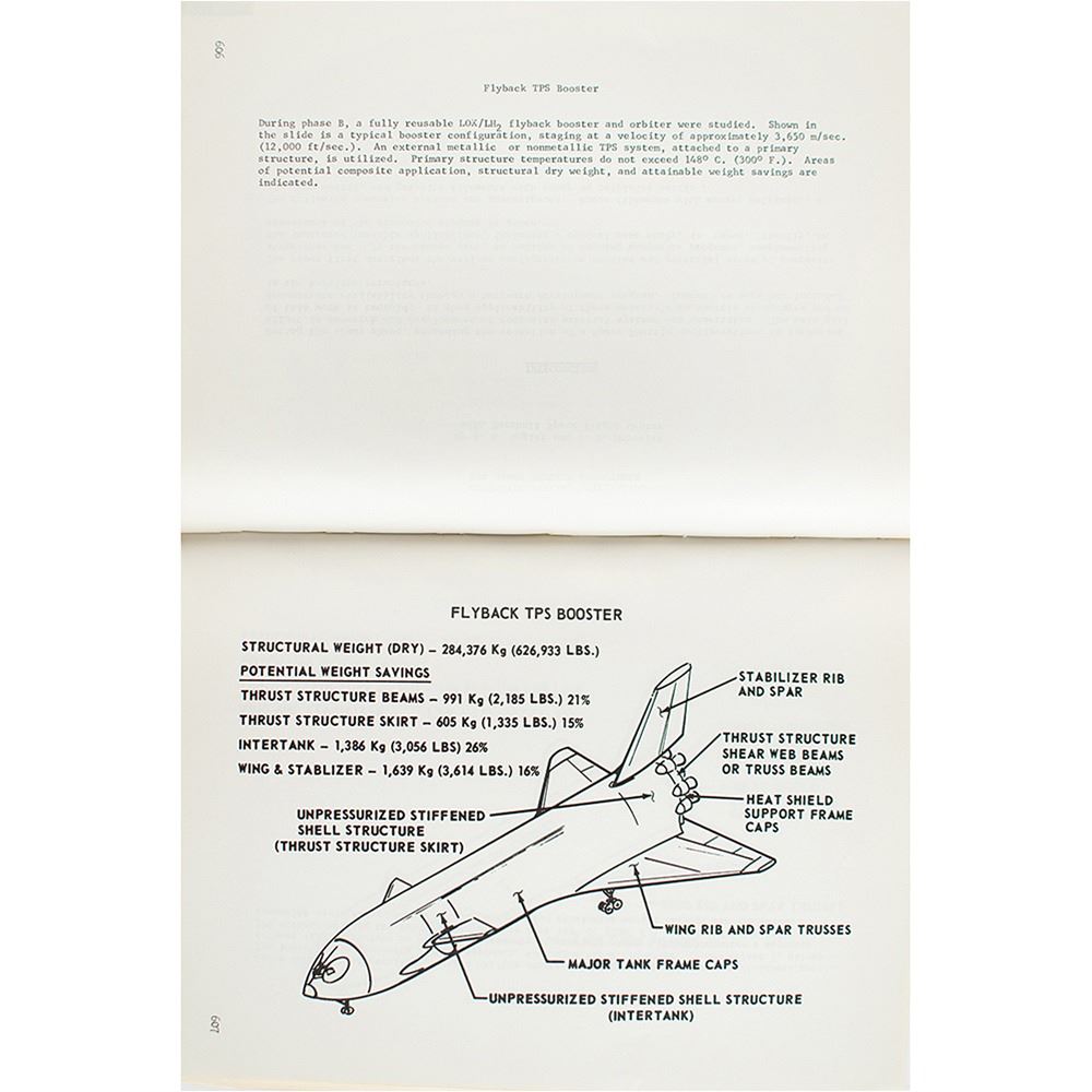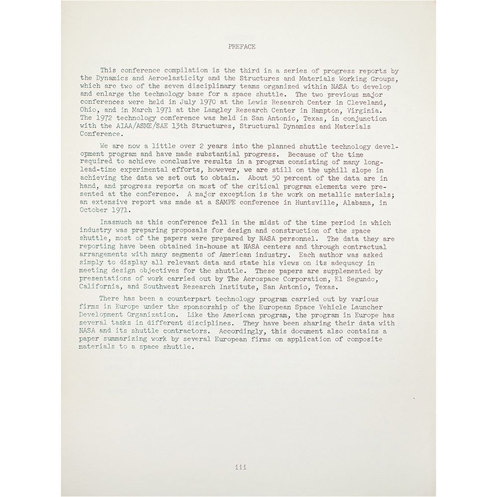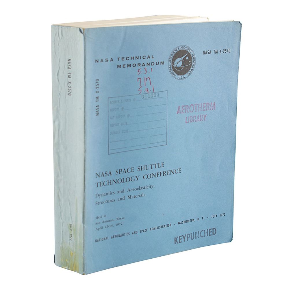 Softcover report official NASA report entitled "NASA Space Shuttle Technology Conference: Dynamics and Aeroelasticity; Structures and Materials (NASA TM X-2570)," held at San Antonio, Texas, April 12‰ÛÒ14, 1972, 8 x 10.5, 770 pages. The report documents the five sessions of the conference, which covered aeroelasticity and loads, structure/liquid interactions, vehicle dynamic test and analysis, thermal protection systems, and structural design. It is filled with schematics, charts, images, tables, and diagrams affiliated with the pioneering technology of the Space Shuttle project during its infancy. In very good to fine condition, with wear to spine and ex-Aerotherm Library stamps.
