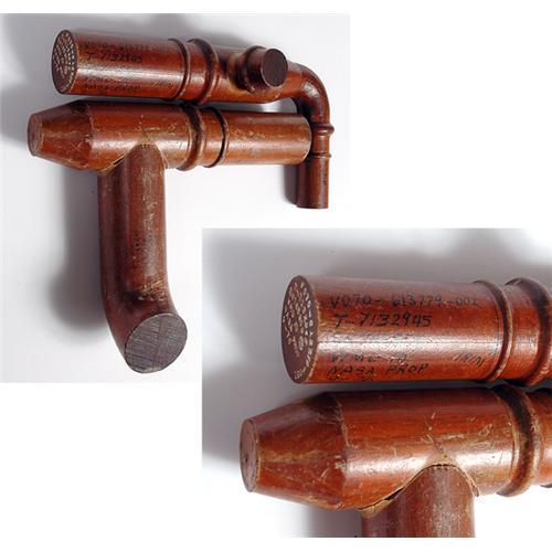 <Our item number 138404><B>Space Shuttle, 1976, NASA Model Shop Wooden Casting Molds.</B> (about 12x6" and 12x9") These two solid wooden positive models were used by the model shop to make casting indentations in sand. One piece, both hand inscribed and engraved on one end, has a NASA ID that reads: "V070-613779-001 / T-7132945 / SN 785858 / WMU ID / NASA Prop / 9-76". The other piece has a mostly illegible ink ID. Both pieces are beautifully machined and were probably used to make engine part castings. Some faults, but quite unusual and great conversation pieces. <BR>Estimated Value $250 - 350. <BR><BR>Our item number 138404<BR><IMAGES><P ALIGN="CENTER"><IMG SRC="http://www.goldbergcoins.net/liveauction/49jpegs/138404.jpg"> </P></IMAGES>