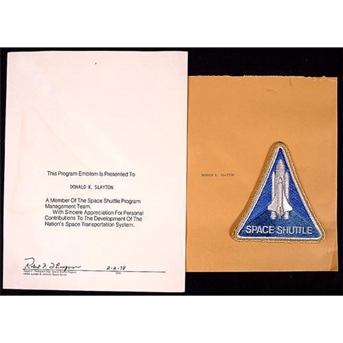 <Our item number 138328><B>Space Shuttle, 1978, An Original "Space Shuttle" Program Patch.</B> (4") An original blue, white, gold patch, unmounted, with an unadorned 8x10" NASA presentation certificate that reads: "This Program Emblem is Presented to / Donald K. Slayton / A Member of the Space Shuttle Program Management Team. With Sincere Appreciation for Personal Contributions to the Development of the Nation's Space Transportation System". There is a printed signature of Robert F. Thompson, Mge. Space Shuttle Program. The original presentation envelope is included with Slayton's name typed on the front. Minor edge bends on the certificate should not detract. Unique. <BR>Estimated Value $250 - 350. <I><BR>Ex. the Donald "Deke" Slayton Estate collection.</I> <BR><BR>Our item number 138328<BR><IMAGES><P ALIGN="CENTER"><IMG SRC="http://www.goldbergcoins.net/liveauction/49jpegs/138328.jpg"> </P></IMAGES>