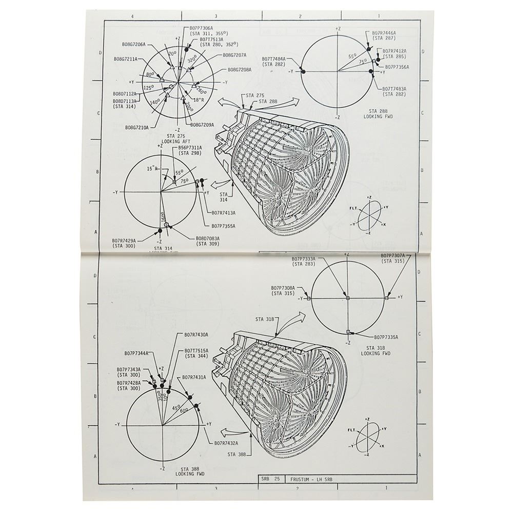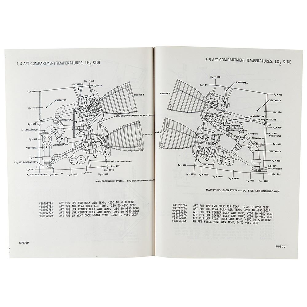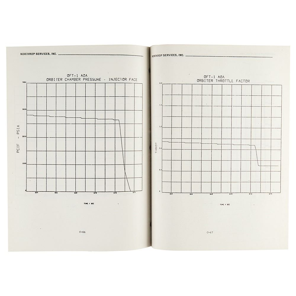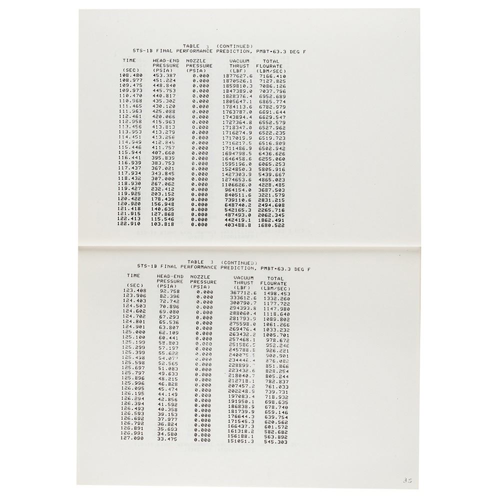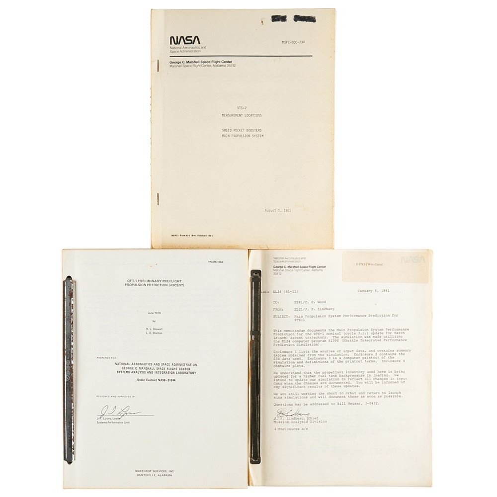Three substantial early reports associated with Space Shuttle propulsion, including: a 560-page document entitled "OFT-1 Preliminary Preflight Propulsion Prediction (Ascent)," June 1976, with hundreds of pages of data from a mission simulation, including numerous chart plots and arcane computational data tables; a ~260-page document on the subject of "Main Propulsion System Performance Prediction for STS-1," January 8, 1981, with similar data from a simulation made utilizing the EL24 computer program SIPPS (Shuttle Integrated Performance Prediction Simulation); and a ~230-page document entitled "STS-2 Measurement Locations: Solid Rocket Boosters, Main Propulsion System," August 1, 1981, describing the locations of each data measurement sensor used in the STS-2 SRBs and MPS in a series of detailed diagrams and sophisticated fold-out charts. In overall fine condition.