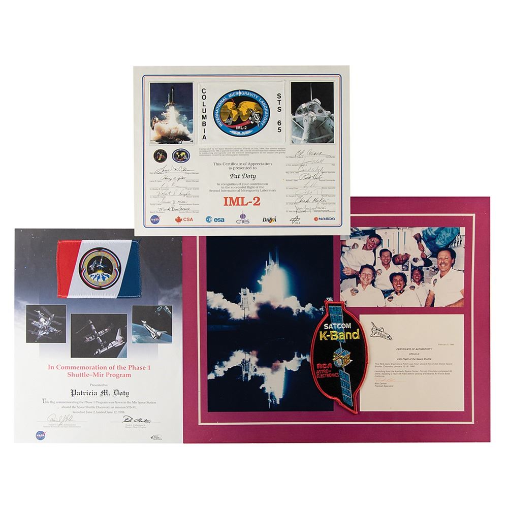 Three items flown on a Space Shuttle flight‰ÛÓan embroidered RCA Astro-Electronics patch, 3.75 x 7.5, carried aboard the Space Shuttle Columbia during the STS-61-C mission, mounted on a color 20 x 16 photo display with images of a launch, the crew, and a certificate of authenticity signed by Payload Specialist Bob Cenker; an International Microgravity Laboratory flag, 5.5 x 4, carried aboard the Columbia during the STS-65 mission, affixed to a 14 x 11 certificate presented to Pat Doty, which bears numerous preprinted signatures of participating astronauts; and a Shuttle-Mir Program flag, 5.5 x 3.75, carried aboard the Space Shuttle Discovery to the Mir space station during the STS-91 mission, affixed to an 11 x 14 certificate presented to Patricia M. Doty, who retired from NASA as a Project Manager in 2007 after a long and rewarding career with the Microgravity office. In overall fine condition, with a chip to the top edge of the 61-C photo display.