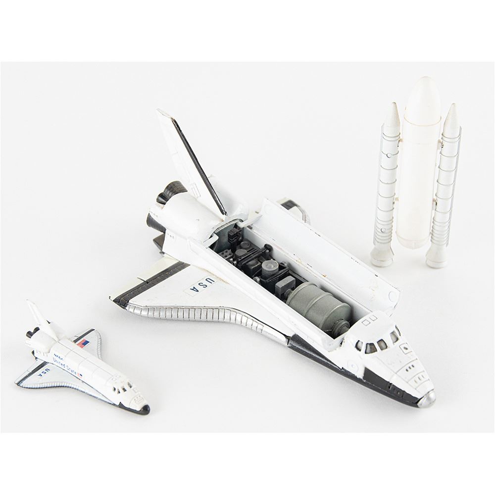 Three small models of the Space Shuttle: a 7" long die-cast toy model of the Space Shuttle Enterprise by Ertl, with cargo bay doors that open to reveal a payload; a 2.75" long die cast model of a Space Shuttle Orbiter by Ertl; and a 4" long metal-and-plastic model of a Space Shuttle's External Tank (ET) with two Solid Rocket Boosters (SRBs) attached. In overall very good to fine condition.