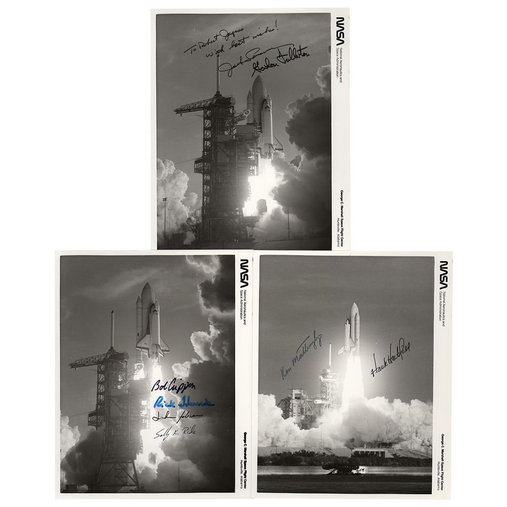 Three official glossy 8 x 10 NASA photos of Space Shuttle launches for missions STS-3, STS-4, and STS-7, each signed in felt tip by its respective crew members: STS-3 (“To Robert Jaques, with best wishes! Jack Lousma†and “Gordon Fullertonâ€), STS-4 (Ken Mattingly and Hank Hartsfield), and STS-7 (Bob Crippen, Rick Hauck, John Fabian, and Sally Ride). Reverse of two photos bear NASA caption text, and all feature “This Paper Manufactured by Kodak†watermarks. In overall fine condition.