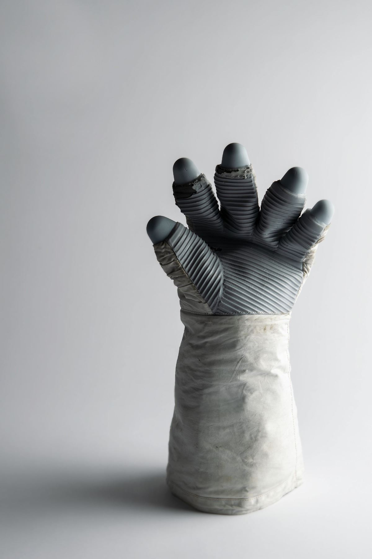 Desirable left-handed 4000 series Space Shuttle glove TMG (Thermal Micrometeoroid Garment), with an ILC-Dover tag on the interior, reading: "Item: TMG, Glove Assy….Serial No. 151…Code ID. 74897," struck through and annotated in red felt tip, "Class III." The glove TMG features a gray palm with blue fingertips. In very good condition, with moderate to heavy wear to the exterior, including some losses to the gray silicone on the fingers. The TMG is the outermost layer of the spacesuit and provides insulation, radiation shielding, and protection from micrometeorites that could otherwise puncture the suit.