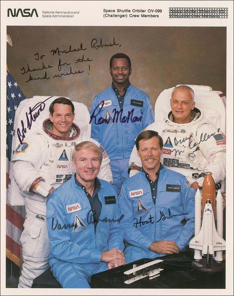 Color 8 x 10 NASA photo, signed and inscribed in black felt tip “To Michael Robuck, Thanks for the kind wishes! Hoot Gibson” and signed by Robert Stewart, Ron McNair, Bruce McCandless, and Vance Brand. In fine condition.