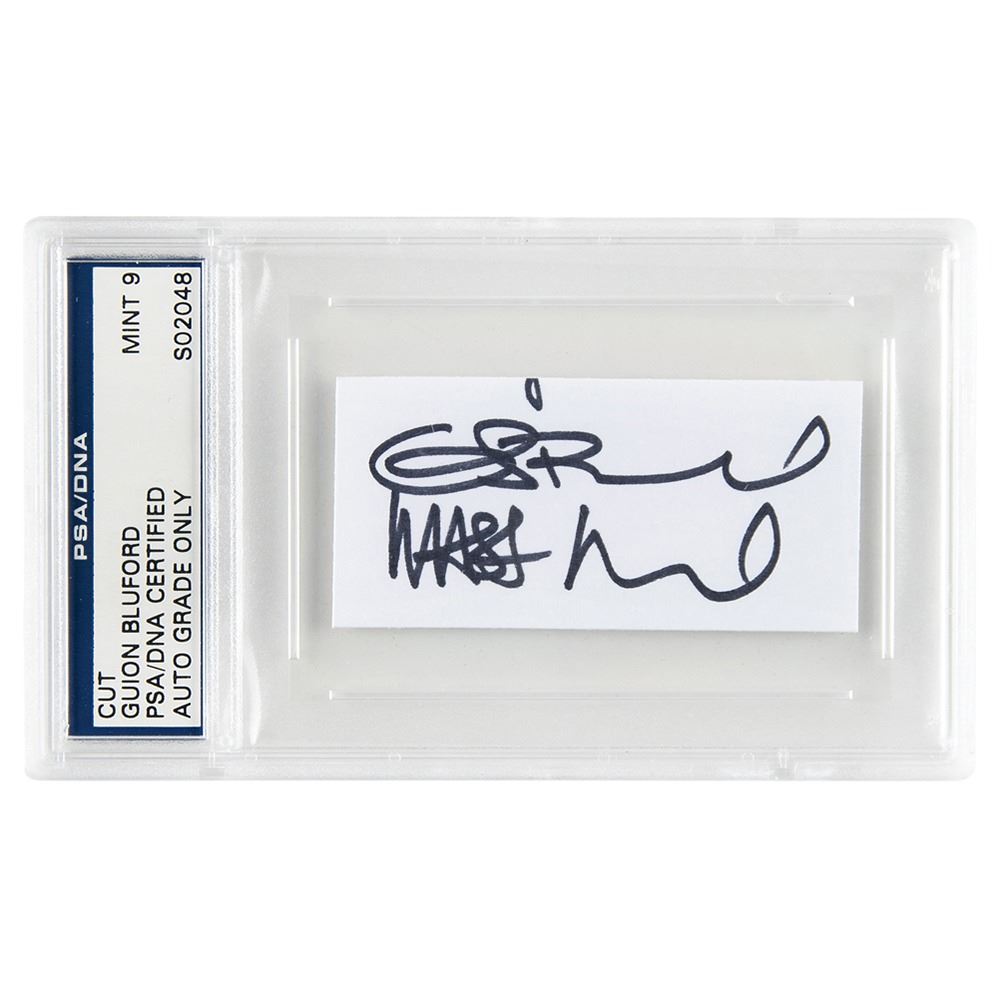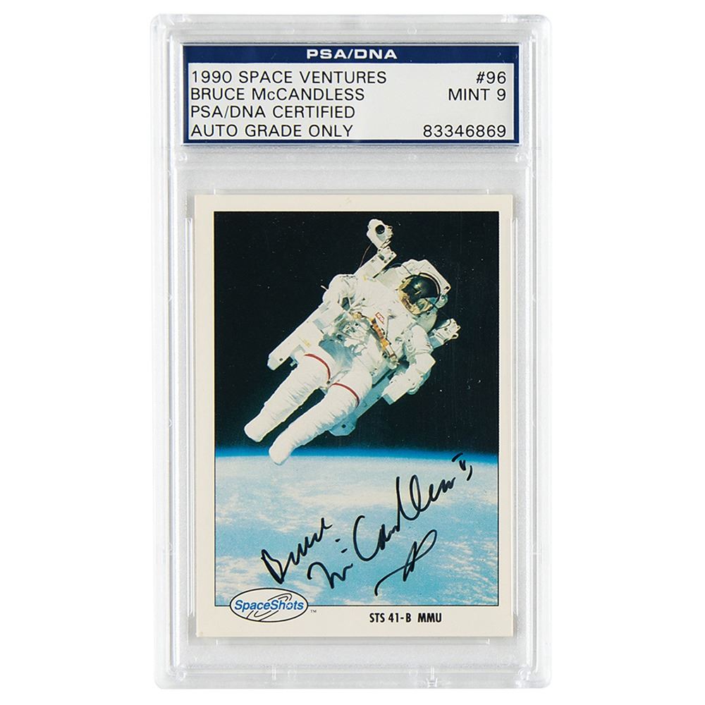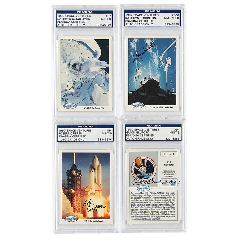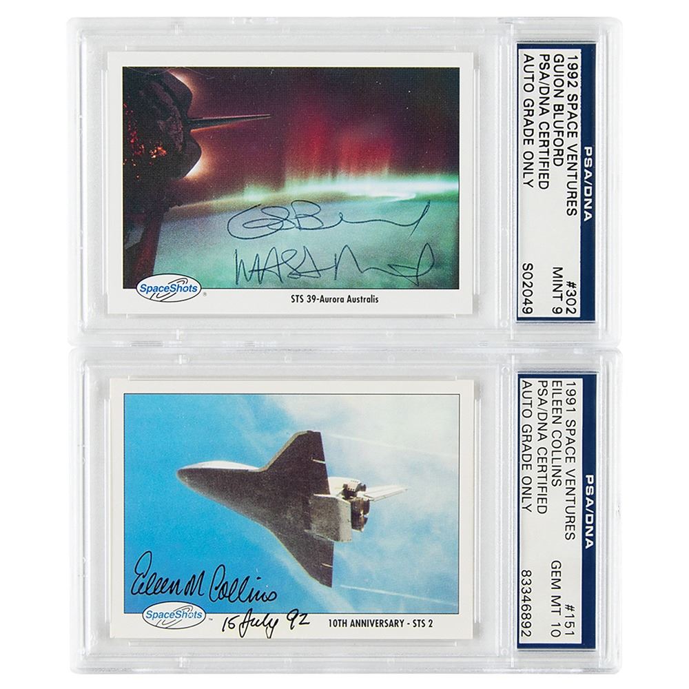 Group lot of seven Space Shots trading cards, each signed on the front or back in ink or felt tip by a Space Shuttle astronaut, all of which are encapsulated in PSA/DNA authentication and grading holders. The astronauts include Guion Bluford (2, both MINT 9), Eileen Collins (GEM MT 10), Bob Crippen (MINT 9), Bruce McCandless (MINT 9), Kathryn Sullivan (MINT 9), and Kathryn Thornton (NM-MT 8). Also includes a cut black felt tip signature of Bluford on a white 3 x 1.25 sheet (MINT 9). In overall fine condition.