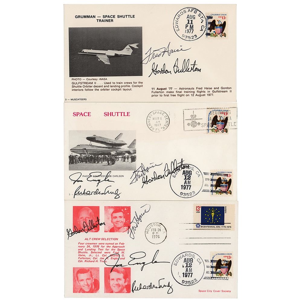 Three covers signed in ink by crews of the Approach and Landing Tests of the prototype Space Shuttle Enterprise, including: a Grumman-Space Shuttle Trainer cover signed by Fred Haise and Gordon Fullerton; a Space Shuttle cover signed by Haise, Fullerton, Joe Engle, and Richard Truly; and an ALT Crew Selection cover signed by all four pictured astronauts. In overall fine condition.