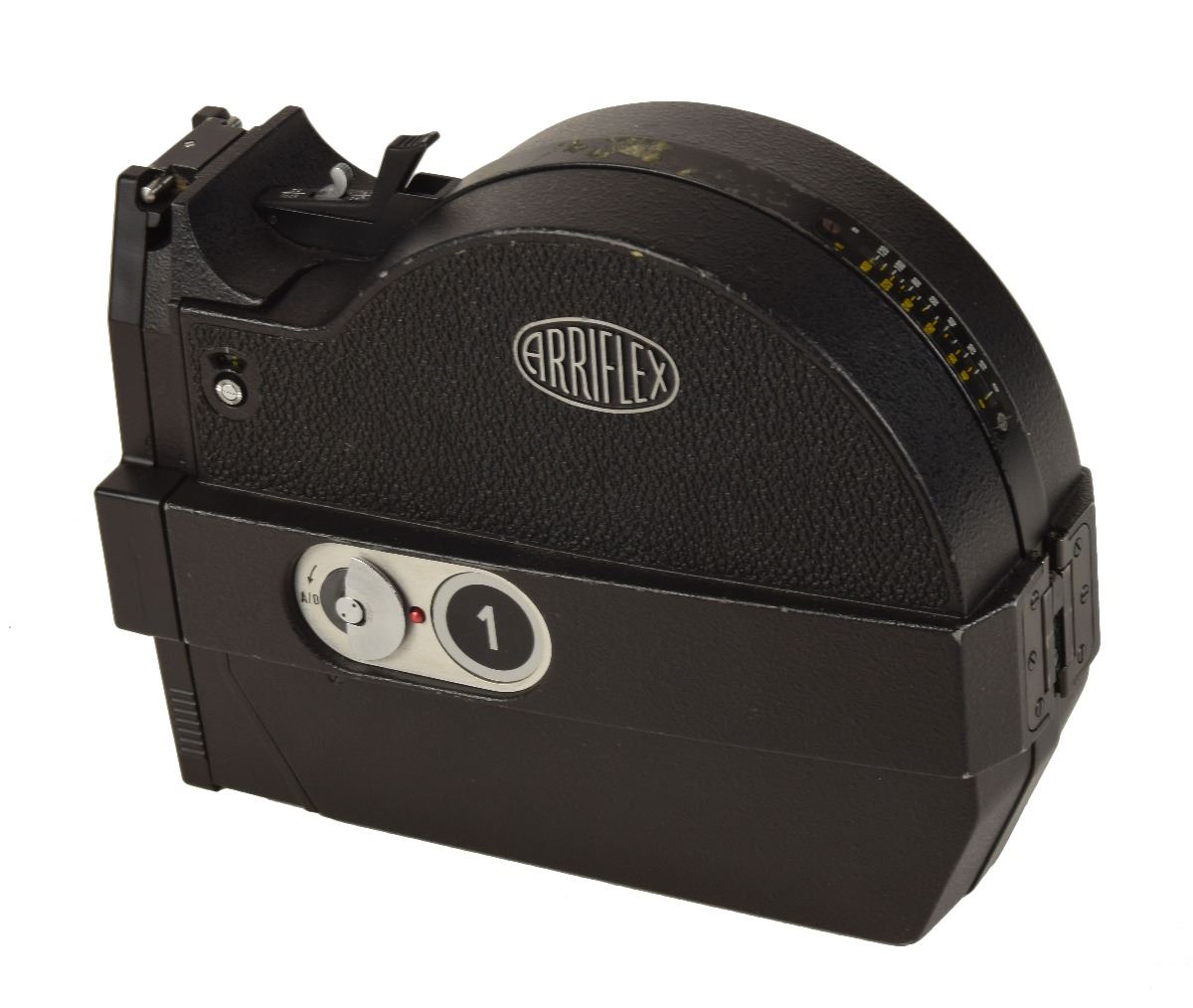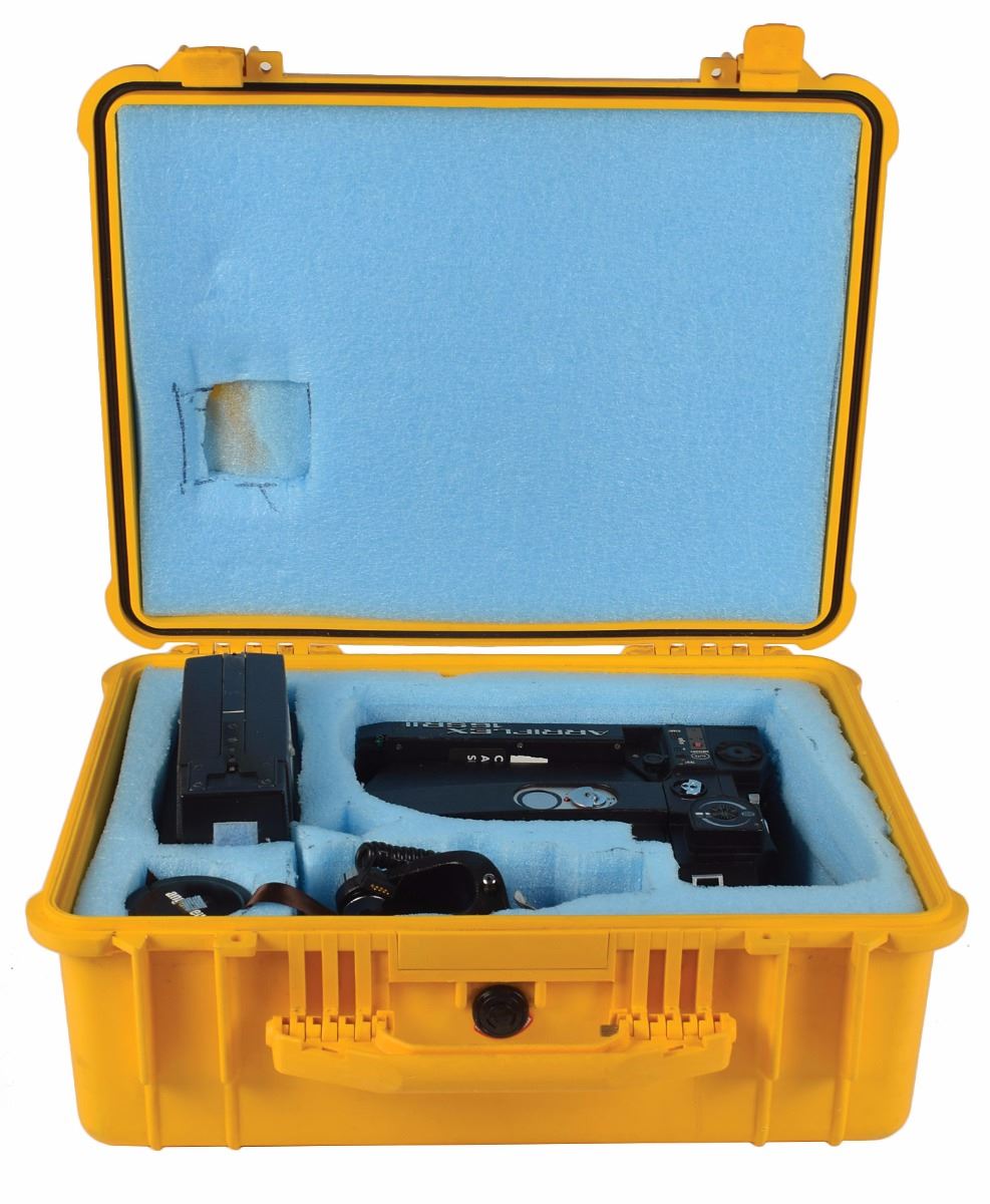 Arriflex SR2 16mm movie camera modified by NASA for use on the Space Shuttle, with a NASA label on the body reading, "Camera, 16mm, Arriflex 16 SR II, SED33102521-301, S/N 1010." The kit includes two film magazines, the pistol grip, the battery adapter, and a NASA-marked Angenieux 5.9mm wide angle lens. In fine condition. The camera had the handle removed and a NASA-standard photographic equipment mount was substituted. It accepts Arri standard and 'B' mount lenses. The consignor notes that this was originally purchased from NASA as a flown example, but the associated documentation has been misplaced.
