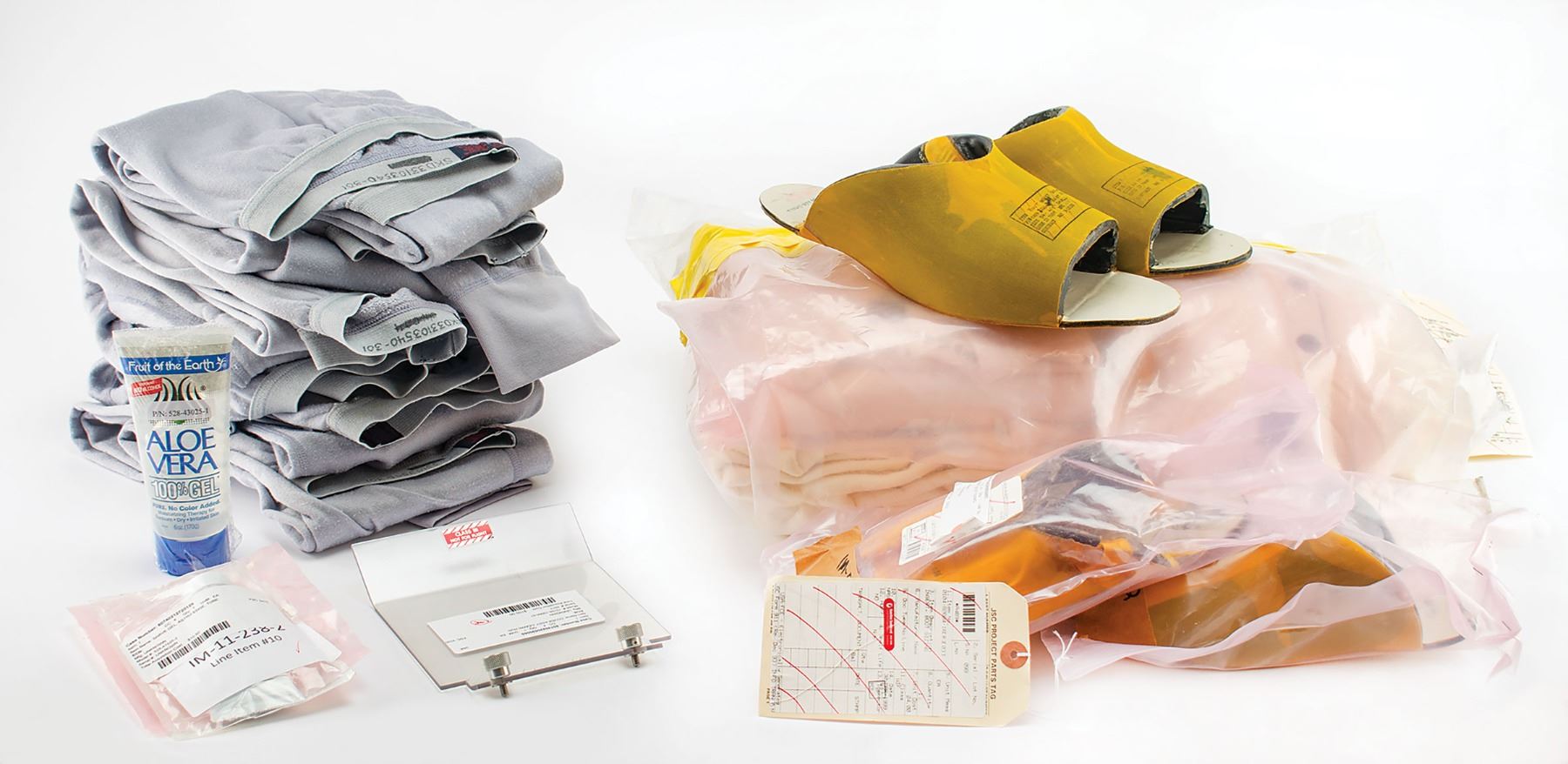 Collection of 18 uncommon Space Shuttle items, the majority related to astronaut wardrobe and hygiene, including: a package of six Patagonia thermal flight tops, each XL, sealed in their original bag with affixed report label and tied deaccession label marked as “Class III” with “Item No. SKD33103541-301”; a package of five Patagonia thermal flight bottoms, each medium, with their original bag with affixed report label and tied deaccession label marked as “Class III” with “Item No. SKD33103540-301”; a set of four Boot Sizing Insert Toe Cap Assemblies for Space Shuttle EMU Boots, with the two left-footed examples measuring 11˝ x 4.5˝ x 3.5˝, and the two right-footed examples measuring 12˝ x 4.5˝ x 3.5˝, denoting sizes of 3 and 4, with part numbers marked on top, each accompanied by their plastic bags with attached deaccession labels (two sealed), and three with their JSC Project Parts tags tied to the bag; a tube of Fruit of the Earth aloe vera gel, with affixed pin number, “528–43025-1,” and original plastic bag with “Scrap” and deaccession labels; a tube of Astro Edge shaving gel, sealed in its original plastic bag bearing affixed NASA-JSA, “Scrap,” and deaccession labels; and a HUD lexan cover assembly, 6˝ x 7.25˝, with engraved part number, “10108–1006-01,” affixed “Class III” and deaccession labels, and original plastic bag with report tag. In overall fine condition.