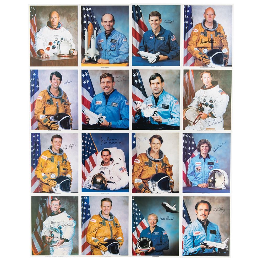 Desirable collection of 16 uninscribed official color 8 x 10 NASA lithographs of Space Shuttle astronauts, each signed in ink by the subject. Includes: Joe Allen, Karol J. Bobko, Vance Brand, Joe Engle, Gordon Fullerton, Jake Garn, Ron Grabe, Dave Hilmers, Donald Holmquest, W. B. Lenoir, John M. Lounge, Jim Newman, Don Peterson, Ken Reightler, Kathryn D. Sullivan, and William E. Thornton. In overall fine condition, with a few minor surface marks and impressions.