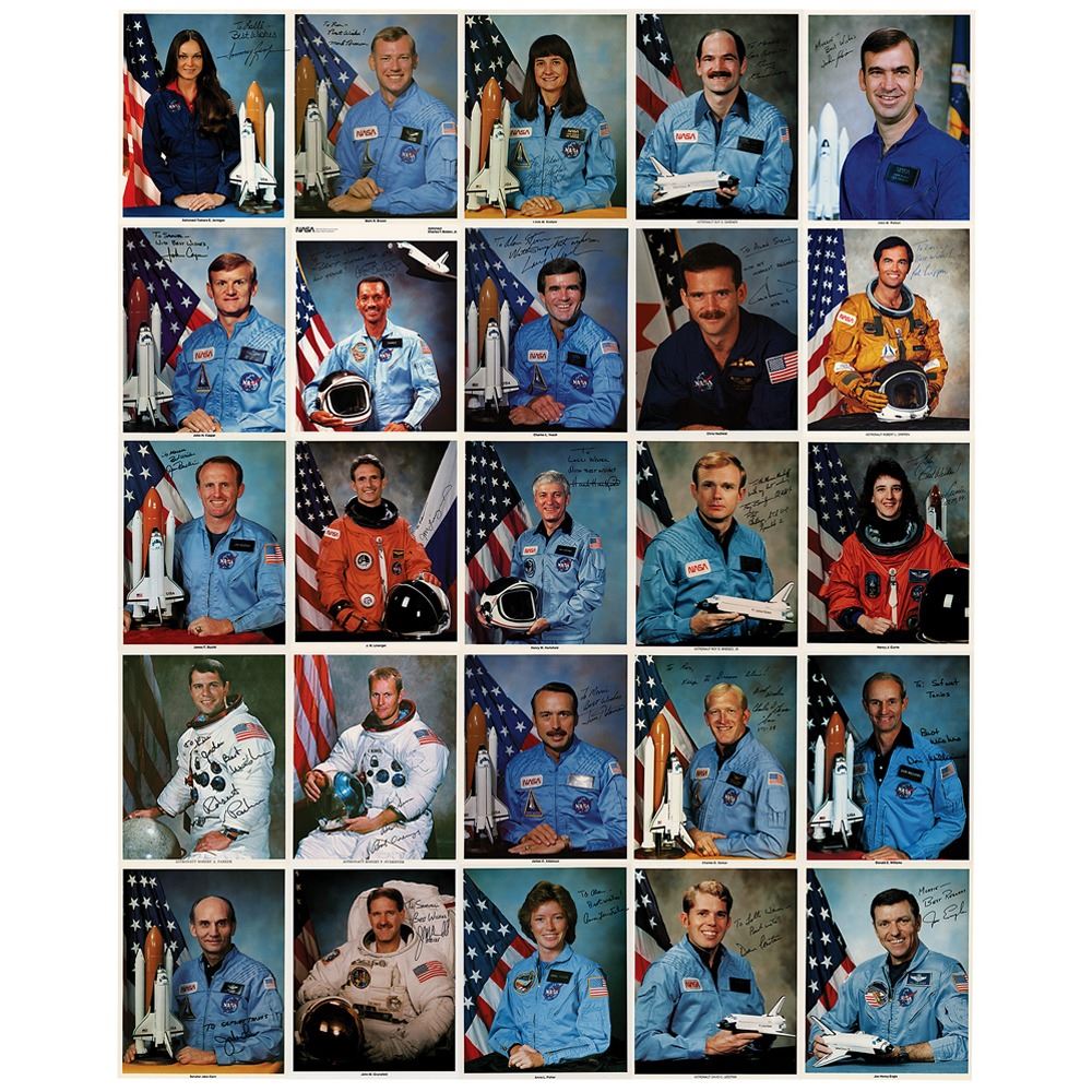 Collection of 25 official color 8 x 10 NASA lithographs of Space Shuttle Astronauts, each signed and inscribed in ink by the subject. Includes: James C. Adamson, Charles Bolden, Roy Bridges, Mark Brown, James Buchli, John Casper, Bob Crippen, Nancy Currie, Joe Engle, John M. Fabian, Anna Lee Fisher, Guy Gardner, Jake Carn, Charles D. Gemar, Linda Godwin, John M. Grunsfeld, Chris Hadfield, Hank Hartsfield, Tamara Jernigan, Dave Leetsma, J. M. Linenger, Bob Overmyer, Robert A. Parker, Lacy Veach, and Don Williams. In overall fine condition, with a few scattered creases.