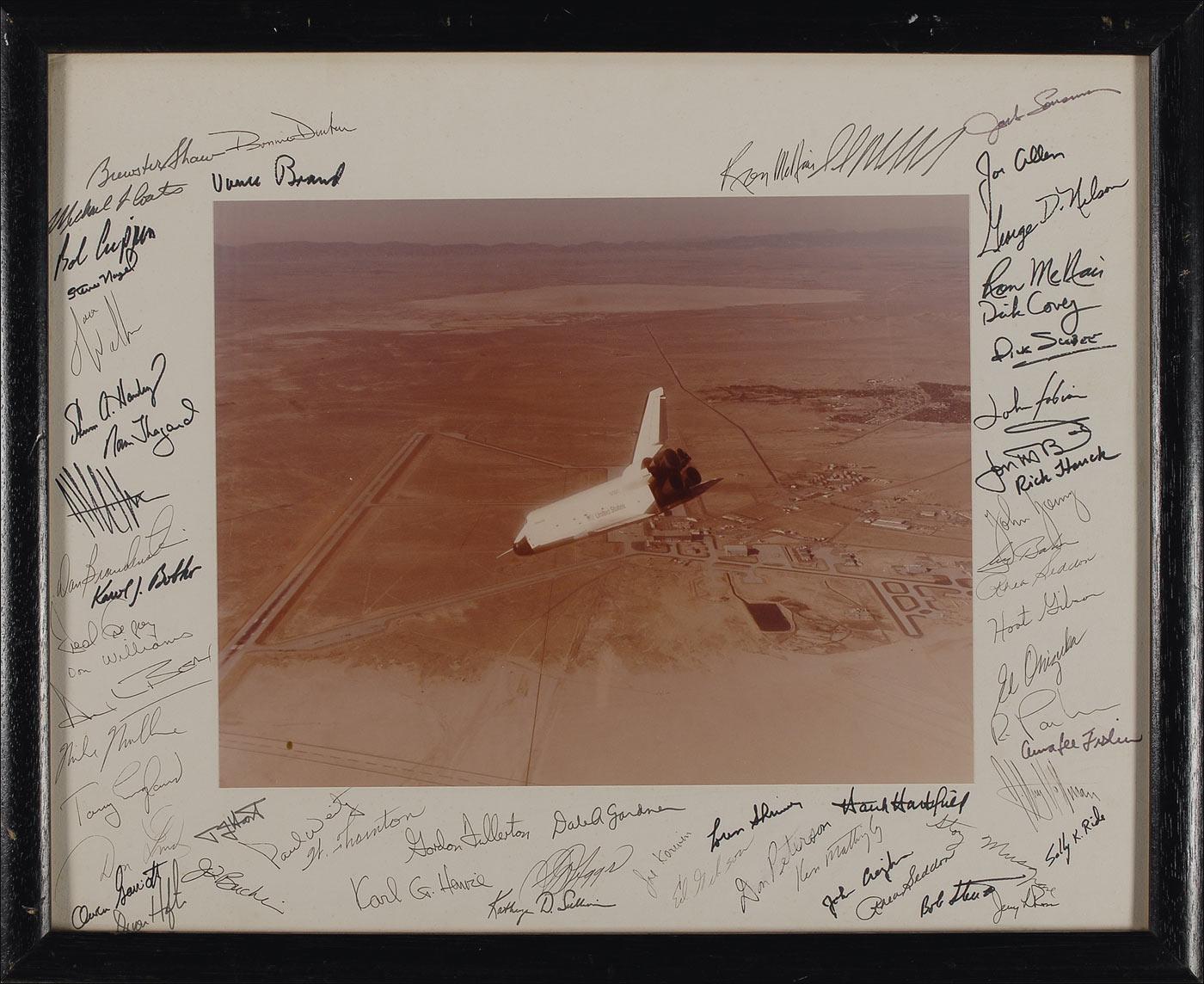 Color glossy 13.25 x 10.5 photo of the Space Shuttle Enterprise flying over a base and runway, affixed to a 19.25 x 15.5 off-white mount, signed on the mount in black ink and felt tip by 60 including: Ron McNair (2), Elison Onizuka, Dick Scobee, John Young, Sally Ride, Ken Mattingly, Bob Crippen, Vance Brand, Karol Bobko, Owen Garriott, Paul Weitz, Gordon Fullerton, Karl Heinze, Joe Kerwin, Ed Gibson, Don Peterson, Story Musgrave, Hoot Gibson, George Nelson, and Joe Allen. Framed to an overall size of 21.5 x 17.5. In fine condition. Oversized.