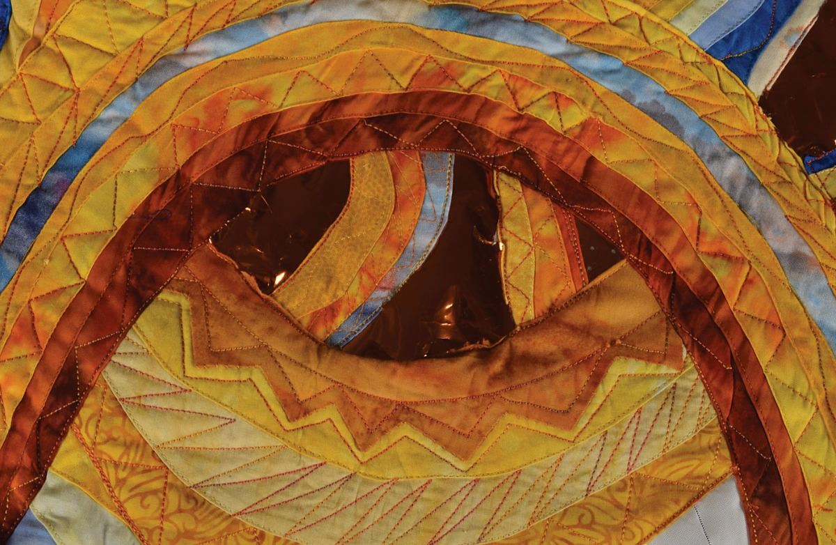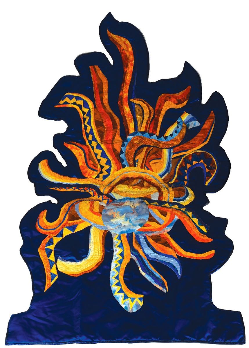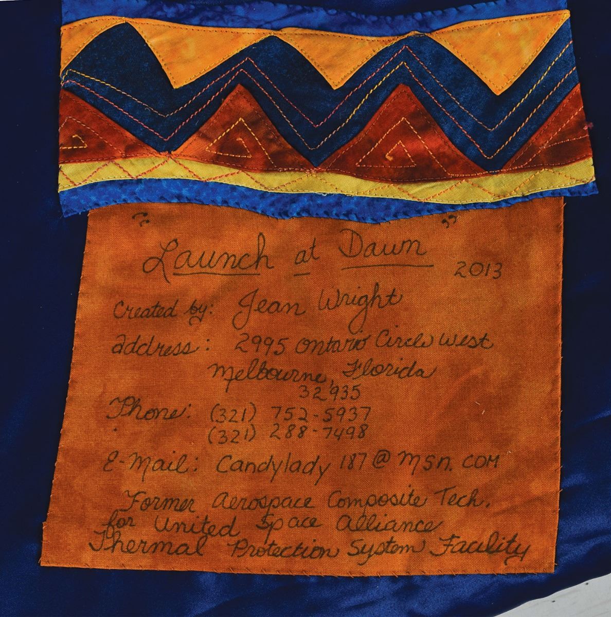 Gorgeous handcrafted quilt created by Jean Wright, a former Aerospace Composite Tech of Soft Goods for NASA’s space shuttle program. Entitled 'Launch at Dawn,' the quilt measures approximately 58 x 79 and is comprised of cotton, various batiks, metallic copper solar shield film (aluminized polymide), and three pieces of Beta cloth (totaling seven square inches) that flew aboard the Space Shuttle Atlantis; the Beta cloth, previously used as cargo bay liner, was removed from the areas between Bays 1 and 2. According to Wright, the design of the quilt represents the tremendous energy and flames of a NASA rocket launch. Stitched to the underside of the quilt is a fabric information sheet signed in black ink by Wright and listing contact information. In fine condition. Accompanied by a certificate of authenticity from the Astronaut Scholarship Foundation, in part: “This certificate verifies that the accompanying quilt, created by Thermal Blanket Technician Jean Wright, is genuine and that the flown Beta cloth used in its design is authentic.” Wright worked on the Endeavor, Atlantis, and Discovery spacecrafts, hand-sewing thermal protection between the gaps in shuttle tiles, referred to as ‘gap fillers,’ which acted as a kind of bumper so the tiles didn’t crack as they vibrated against each other during reentry. Originating from the Astronaut Scholarship Foundation, a portion of the proceeds for the sale of this item will be donated to the ASF.