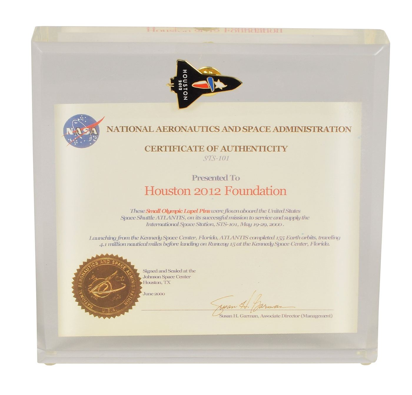 Flown Olympic “Houston 2012” lapel pin carried aboard the Space Shuttle Atlantis during the STS–101 mission. The black Atlantis-shaped pin with patriotic Olympic torch symbol measures 1 x .75 and is encased in a 5.25 x 5.25 x 1 block of Lucite with a NASA certificate of authenticity presented to “Houston 2012 Foundation,” which reads: “These Small Olympic Lapel Pins were flown aboard the United States Space Shuttle Atlantis, on its successful mission to service and supply the International Space Station, STS–101, May 19–29, 2000. Launching from the Kennedy Space Center, Florida, Atlantis completed 155 Earth orbits, traveling 4.1 million nautical miles before landing on Runway 15 at the Kennedy Space Center, Florida.” In fine condition. Houston was one of several cities vying to host the 2012 Summer Olympics, an honor that was eventually awarded to London.