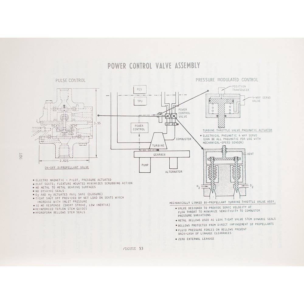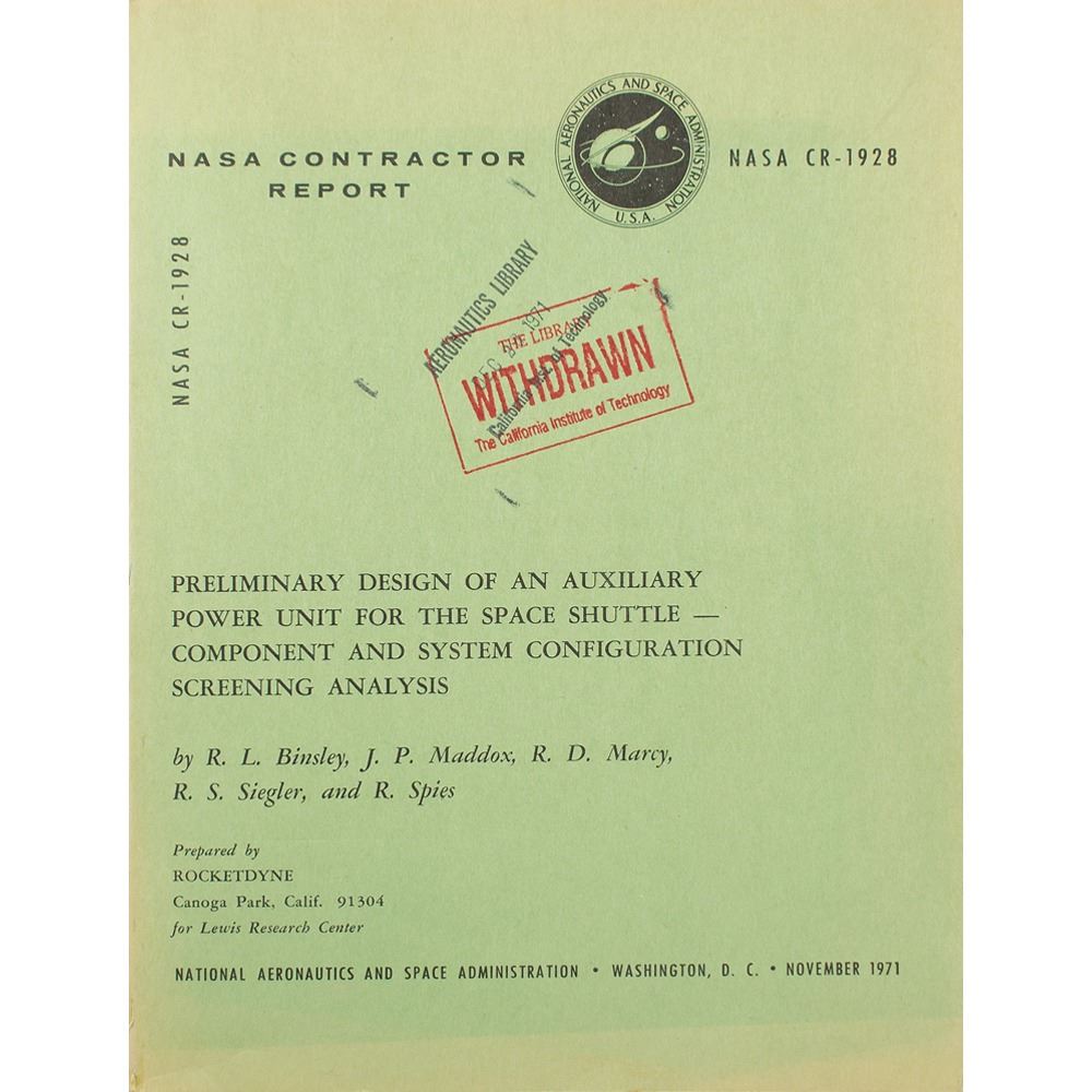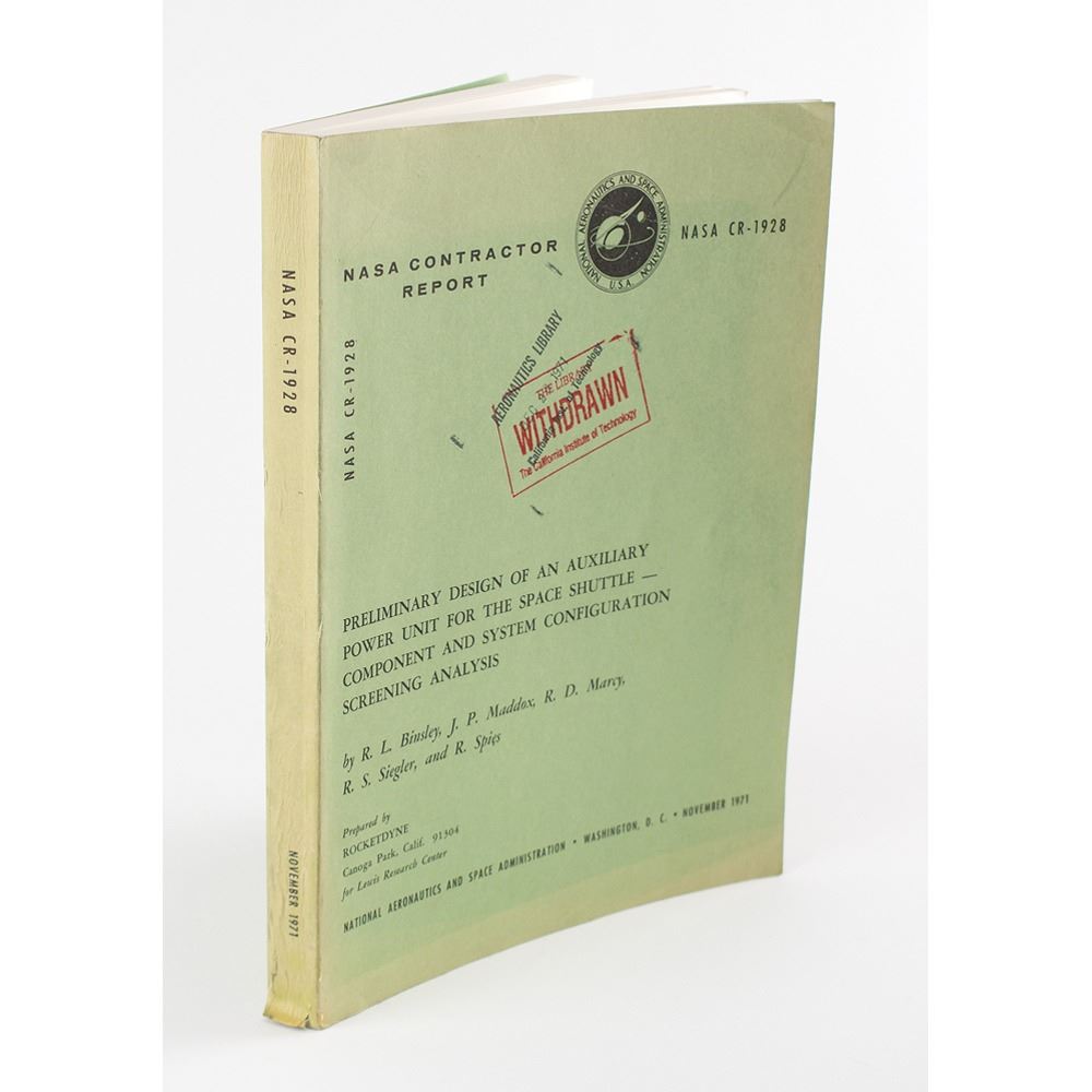 NASA Contractor Report manual (CR-1928) entitled “Preliminary design of an Auxiliary Power Unit for the Space Shuttle—Component and System Configuration Screening Analysis” by R. L. Binsley, J. P. Maddox, R. D. Marcy, R. S. Siegler, and R. Spies, prepared by Rocketdyne for the Lewis Research Center, November 1971, 296 pages, 8 x 10.5, with the front cover bearing two California Institute of Technology stamps and the front cover bearing an affixed Cal Tech address label. The manual contains numerous detailed graphs and illustrated figures for the following sections: Introduction, Summary and Conclusion, Preliminary Analysis—Phase IA, APU Tradeoff Studies—Phase IB, APU Storable Propellant Study, Reliability, and Appendix A—Preliminary Analysis—Phase IA. The introduction, in part: “This report presents data on a Phase I study of auxiliary power units to supply hydraulic and electrical power for both the orbiter and booster vehicles of the space shuttle. The program objective is to provide analysis and design information for gaseous oxygen/hydrogen and storable propellant APU’s.” In fine condition, with some wear to spine.