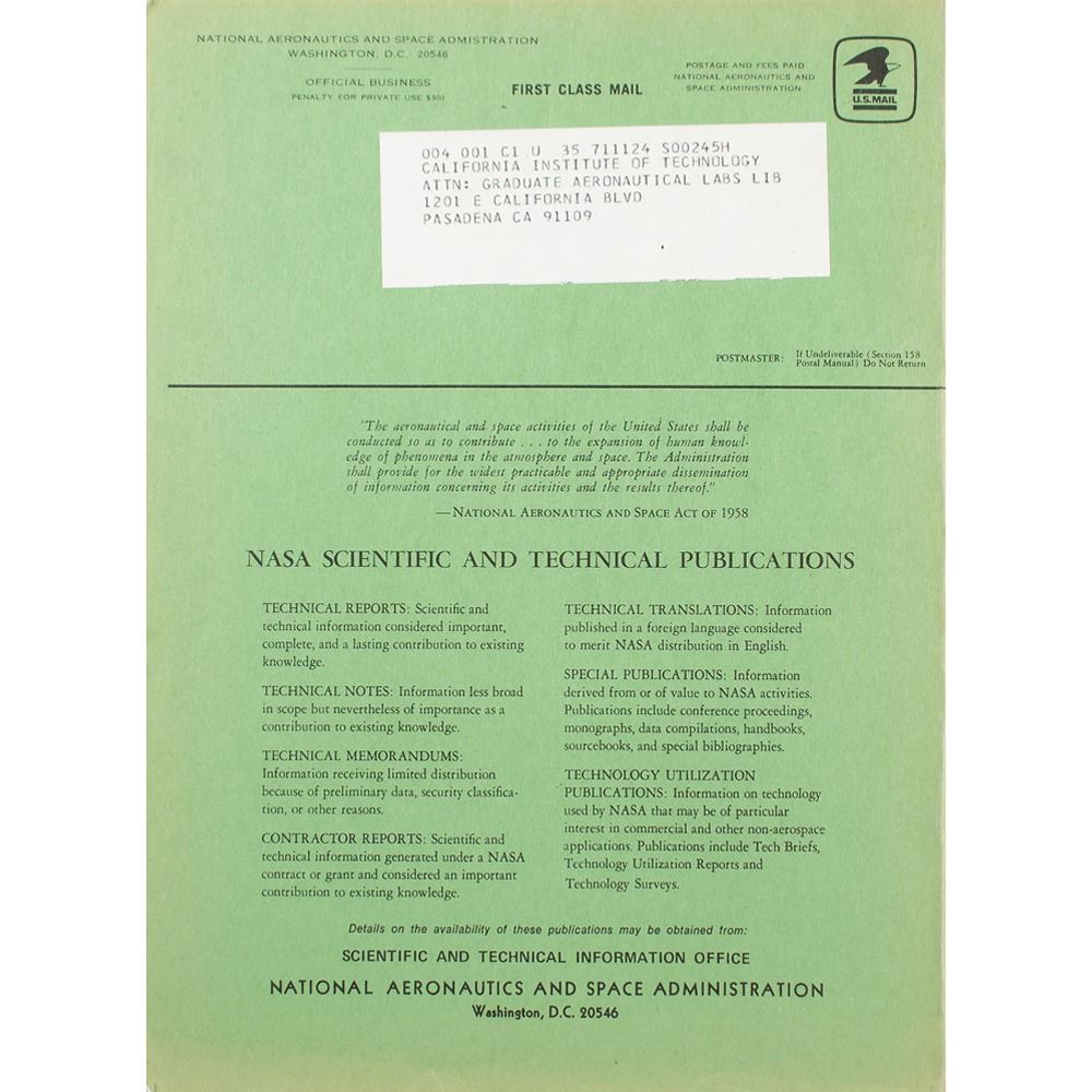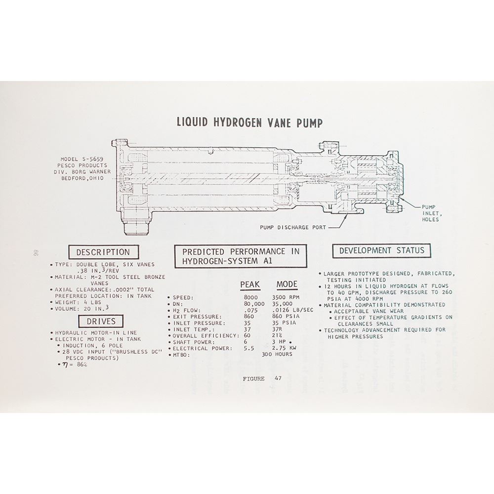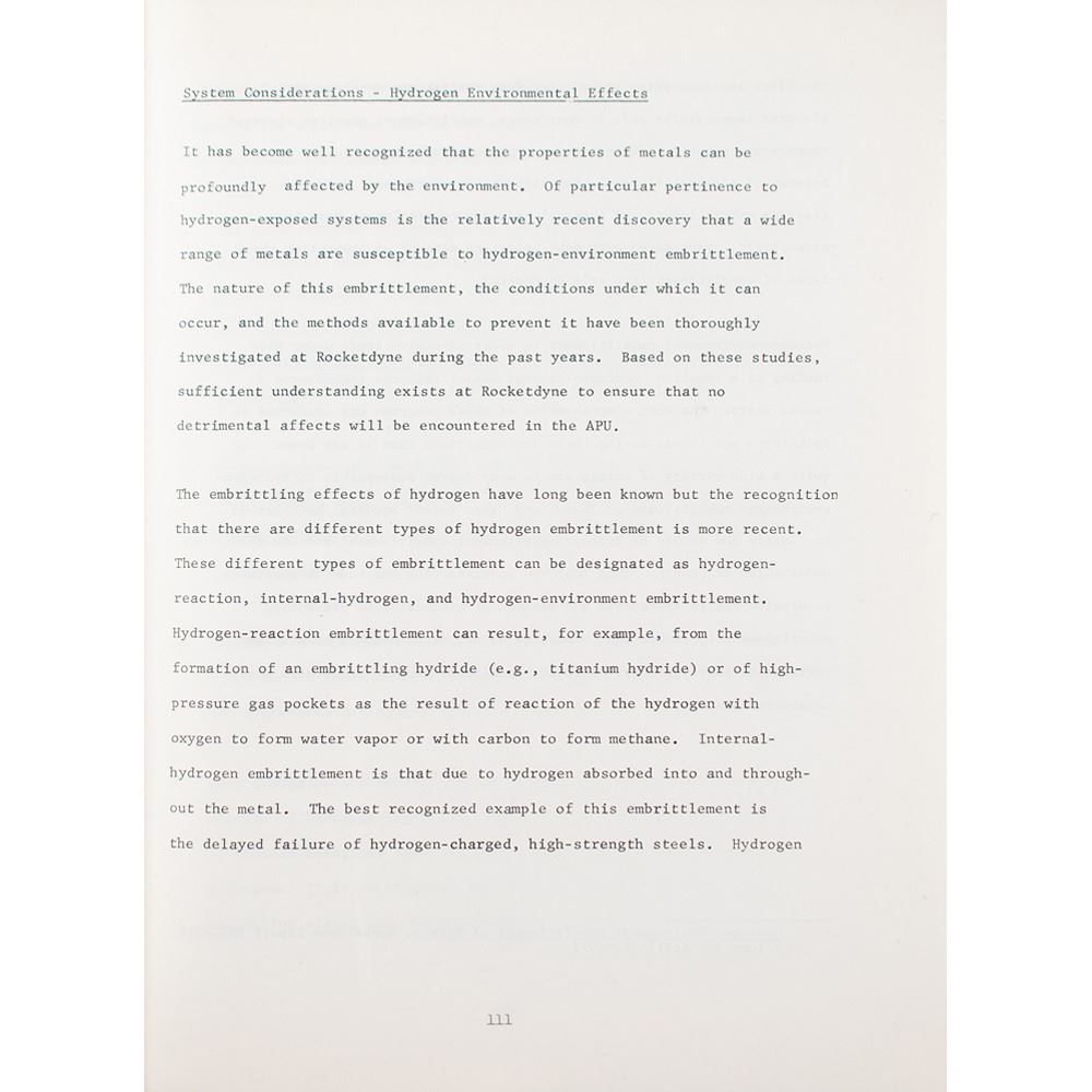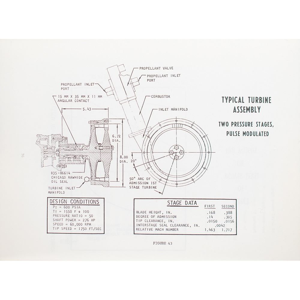 NASA Contractor Report manual (CR-1928) entitled “Preliminary design of an Auxiliary Power Unit for the Space Shuttle—Component and System Configuration Screening Analysis” by R. L. Binsley, J. P. Maddox, R. D. Marcy, R. S. Siegler, and R. Spies, prepared by Rocketdyne for the Lewis Research Center, November 1971, 296 pages, 8 x 10.5, with the front cover bearing two California Institute of Technology stamps and the front cover bearing an affixed Cal Tech address label. The manual contains numerous detailed graphs and illustrated figures for the following sections: Introduction, Summary and Conclusion, Preliminary Analysis—Phase IA, APU Tradeoff Studies—Phase IB, APU Storable Propellant Study, Reliability, and Appendix A—Preliminary Analysis—Phase IA. The introduction, in part: “This report presents data on a Phase I study of auxiliary power units to supply hydraulic and electrical power for both the orbiter and booster vehicles of the space shuttle. The program objective is to provide analysis and design information for gaseous oxygen/hydrogen and storable propellant APU’s.” In fine condition, with some wear to spine.