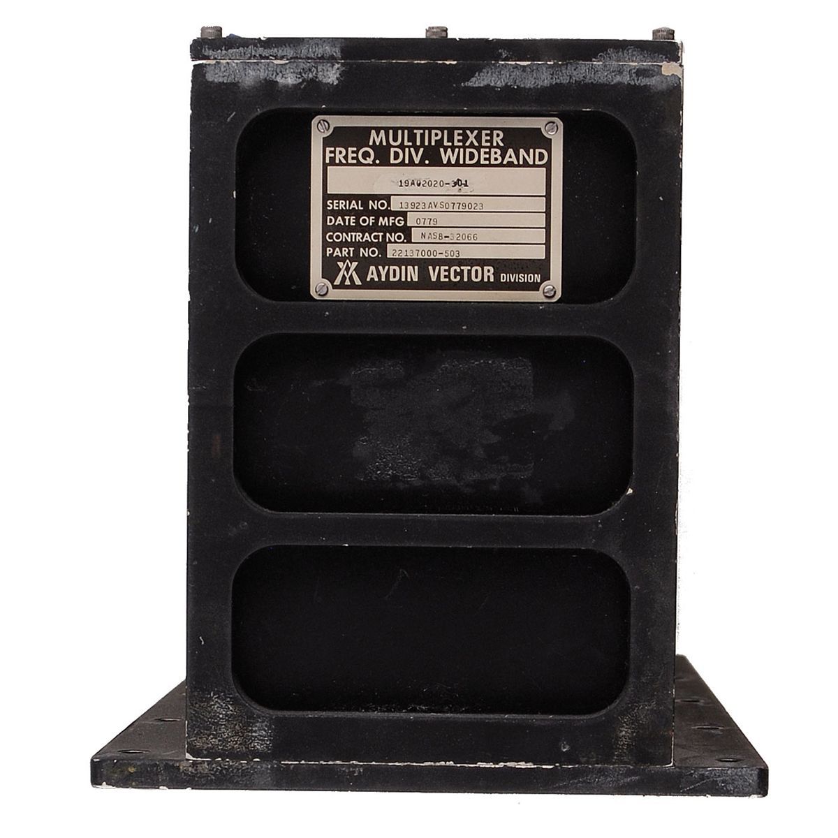 Space Shuttle avionics black box. Box measures 11 x 9.5 x 4, weighs 11.3 pounds, and bears a metal plate labeled “Multiplexer Freq. Div. Wideband,” made by Aydin Vector. End opposite the plate has seven plugs, all with caps (6 red and one metallic), labeled J1–J7. In fine condition.