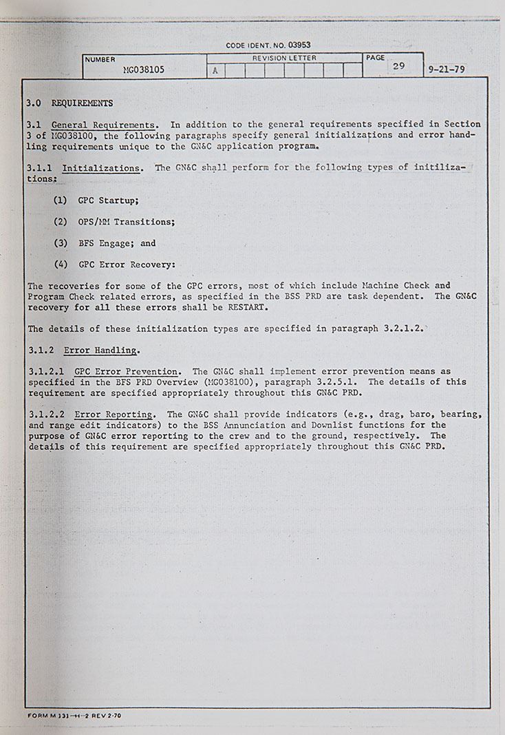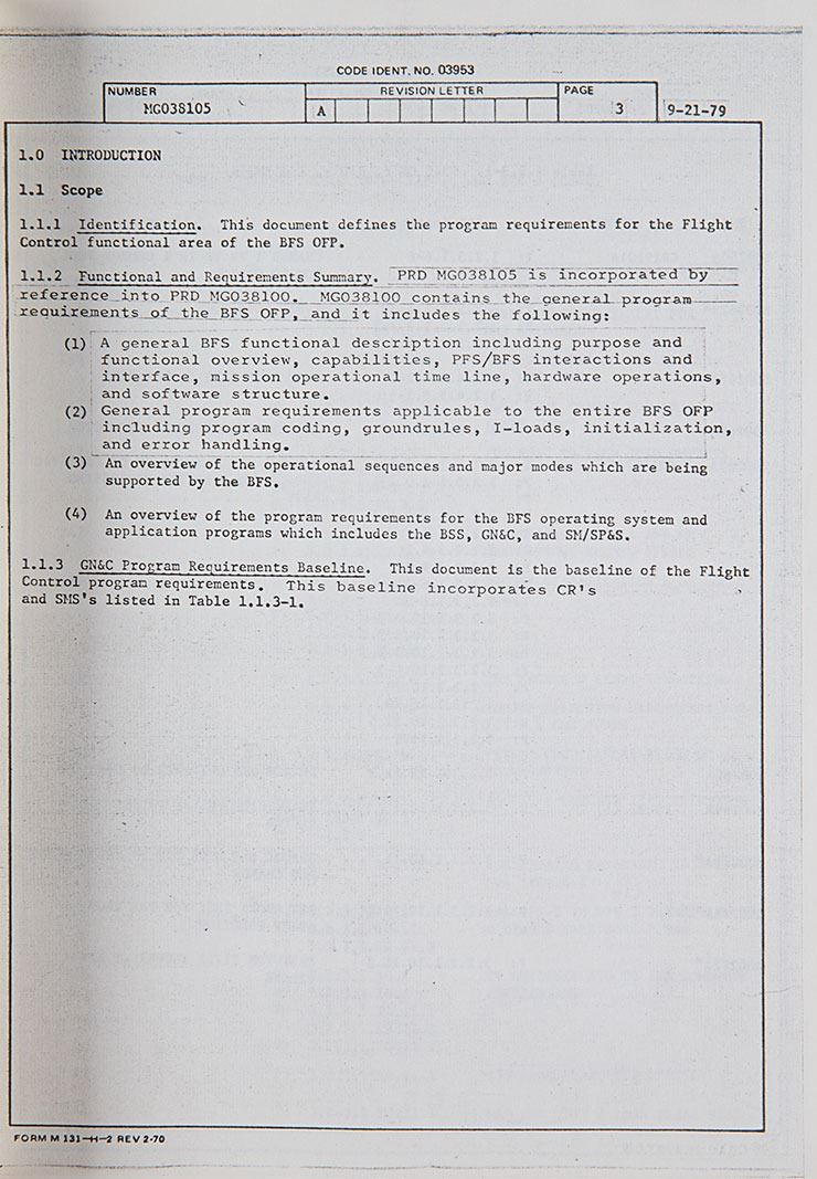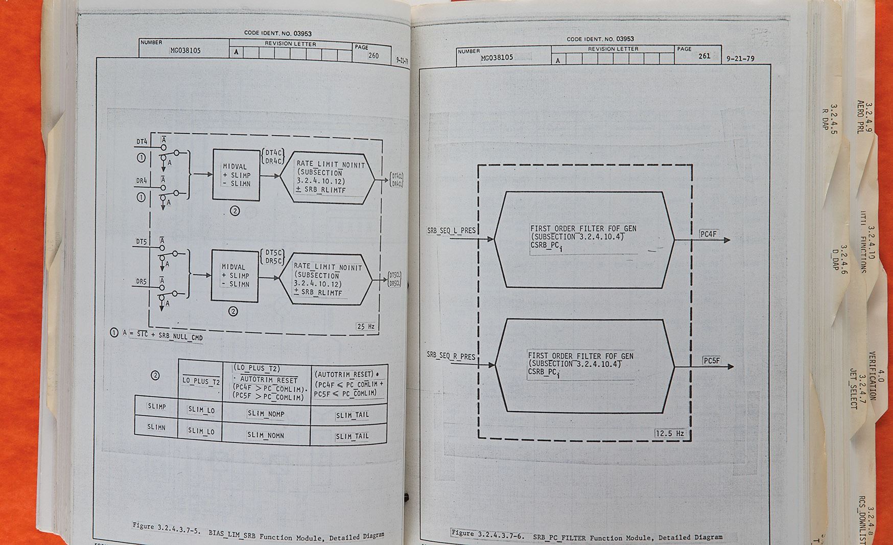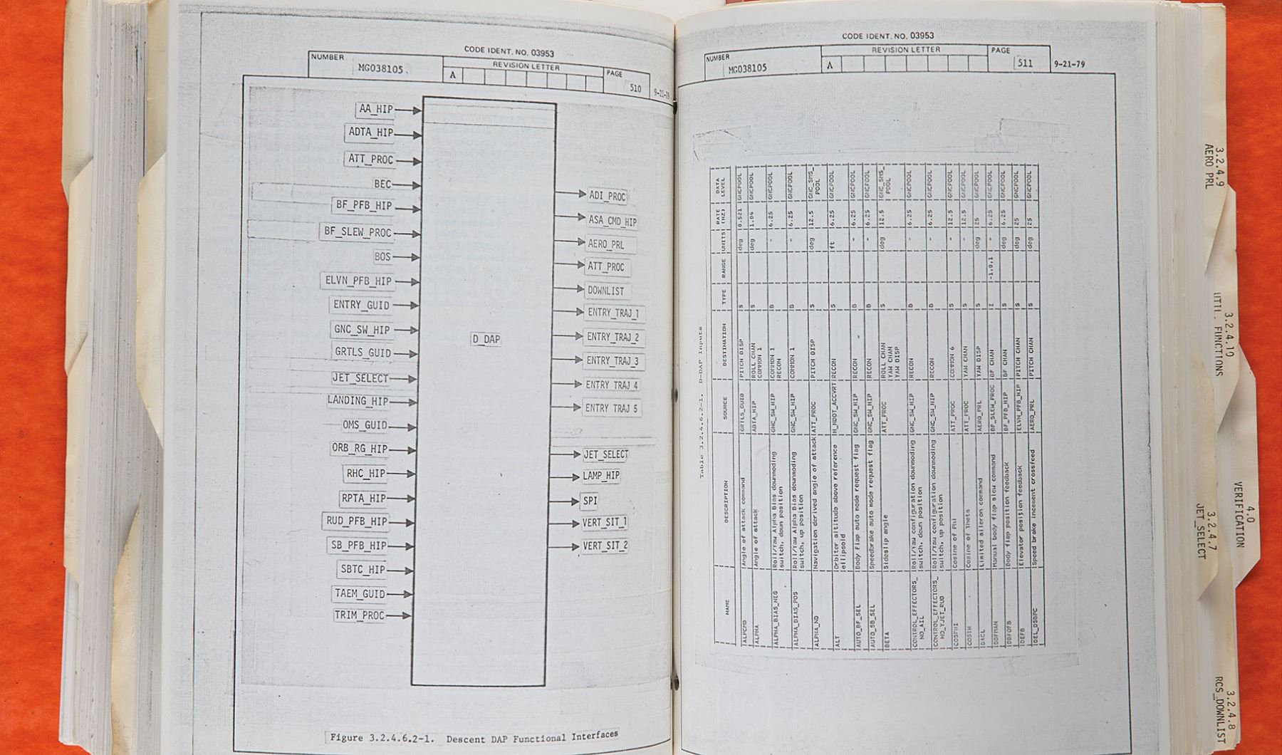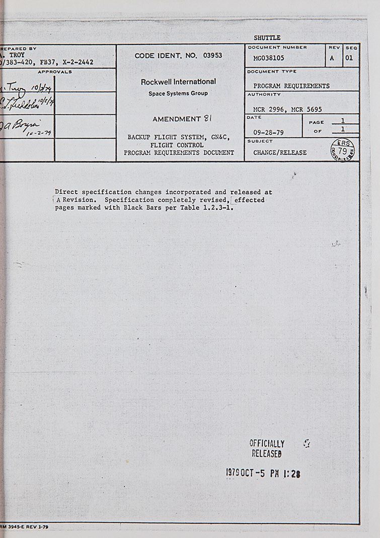 Space Shuttle "Backup Flight System, GN&C, Flight Control Program Requirements Document" issued by Rockwell International on October 5, 1979. Comprising over 800 pages, the document is separated by tabs marked "Intro," "Rqmnts," "ADAP," "TDAP," "RDAP," "DDAP," "Jet Select," "RCS Downlist," "Aero PRL," "Util Functions," and "Verification." The document consists of numerous descriptions, tables, lists, and diagrams related to the Shuttle's Backup Flight System, Guidance, Navigation, and Control, and Flight Control systems. In fine condition.