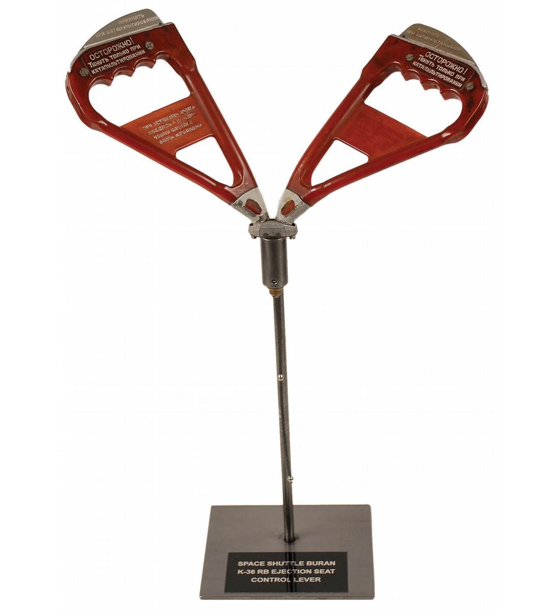 Shuttle Buran ejection seat control lever. Lever consists of two heavy red rubber handles with hand activated release levers at the top of each which would activate the ejection mechanism. Both handles are also extensively labeled in Russian. Affixed to a 15? vertical display stand with a descriptive plaque on the base. In fine condition, with expected handling wear. Two Burans were manufactured and prepared for launch, but after a single unpiloted orbital mission, and the collapse of the Soviet Union, the program was canceled.