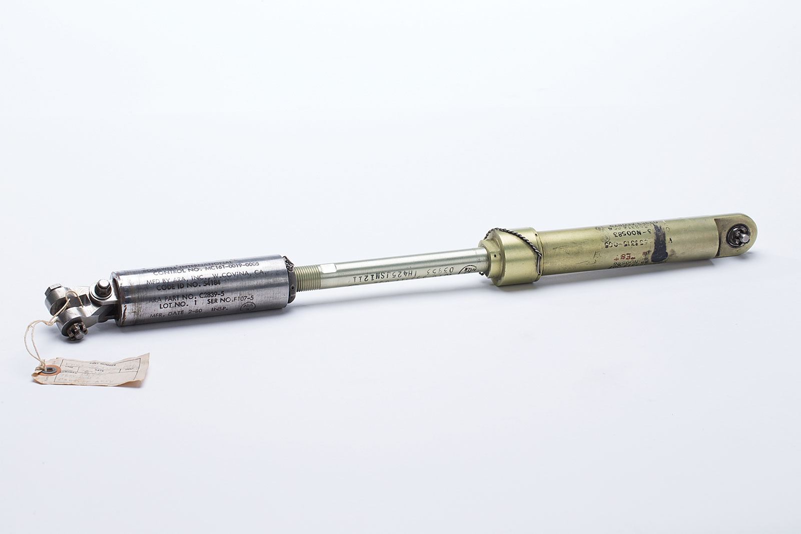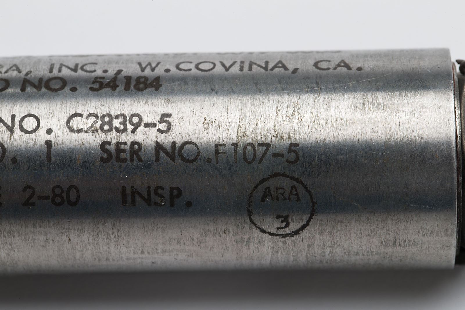 Space Shuttle Cable Attenuator Strut, measuring 18.25? long and 1? in diameter, marked on the side, "Cable Attenuator Type V, Rockwell International Control No. MC161-0019-0005, Mfd. by ARA, Inc….Mfr. Date 2-80." The other components bears additional part numbers and markings, and the attached paper tag identifies the complete piece as "Part Number V070-553314-006, Date 10-29-82, Remarks: LR3297, Test Run 2, Capture Assy." In fine condition.
