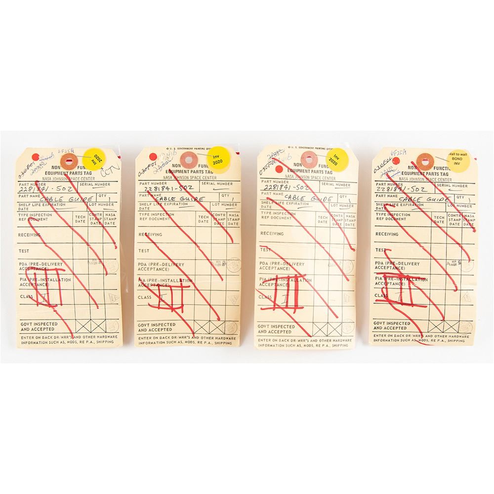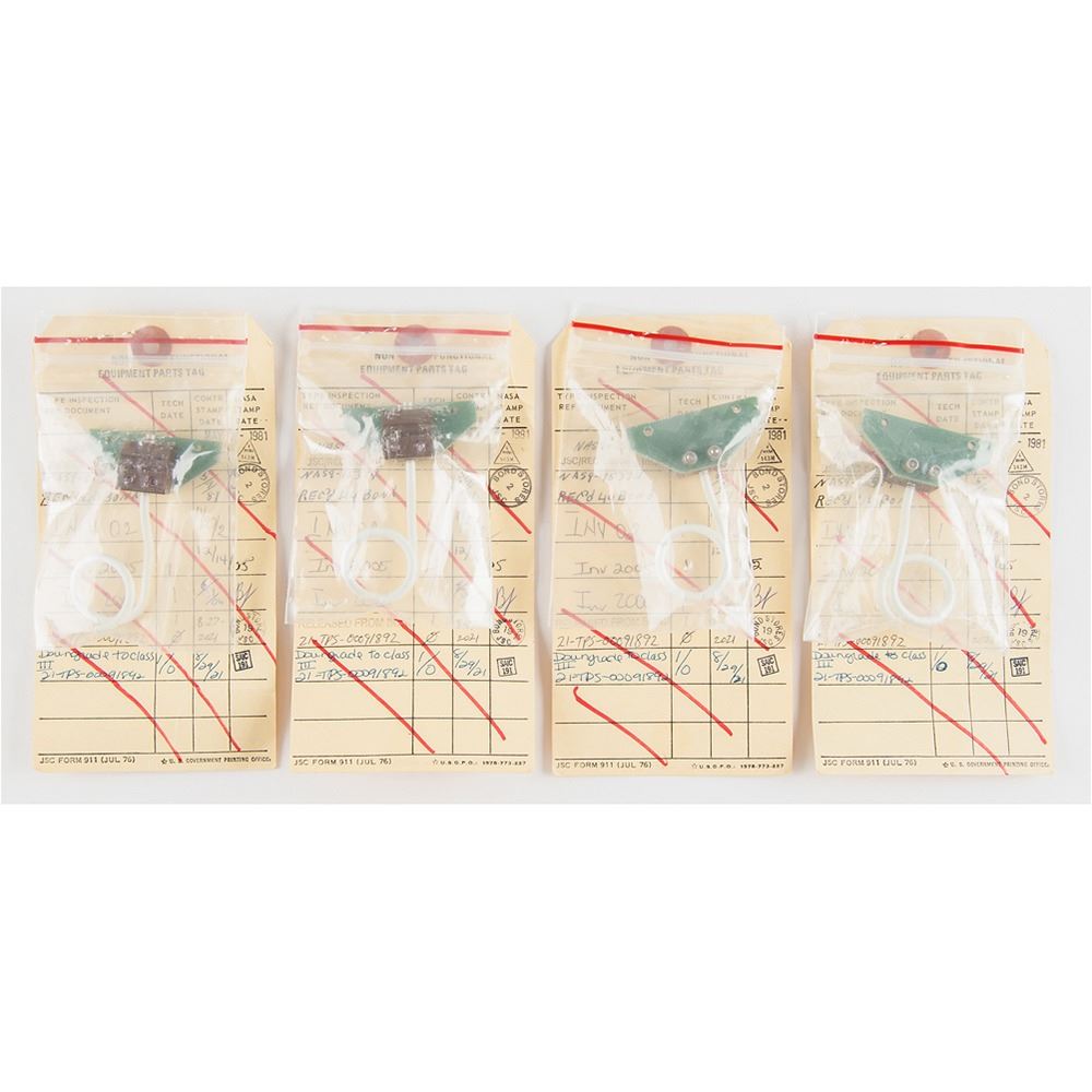 Lot of four cable guide assemblies designed for use during the Space Shuttle program. Each assembly measures 2˝ x 3˝, consists of a curled loop of white metal that lowers from a small mountable bracket, and is housed in its original deaccession bag with stapled JSA “Non Functional Equipment Parts Tag,” the fronts of which are struck through in red felt tip and marked “III” and bear matching part numbers: “2281841-502.” The reverse of each is annotated at the top as “NAS9-15374” and stamped “JSC/REC Delivery Inspection (I&D)” and dated to May 7, 1981. The bottommost writing is dated August 29, 2021, and reads: “Downgrade to class III, 21-TPS-00091892.” In overall fine condition.