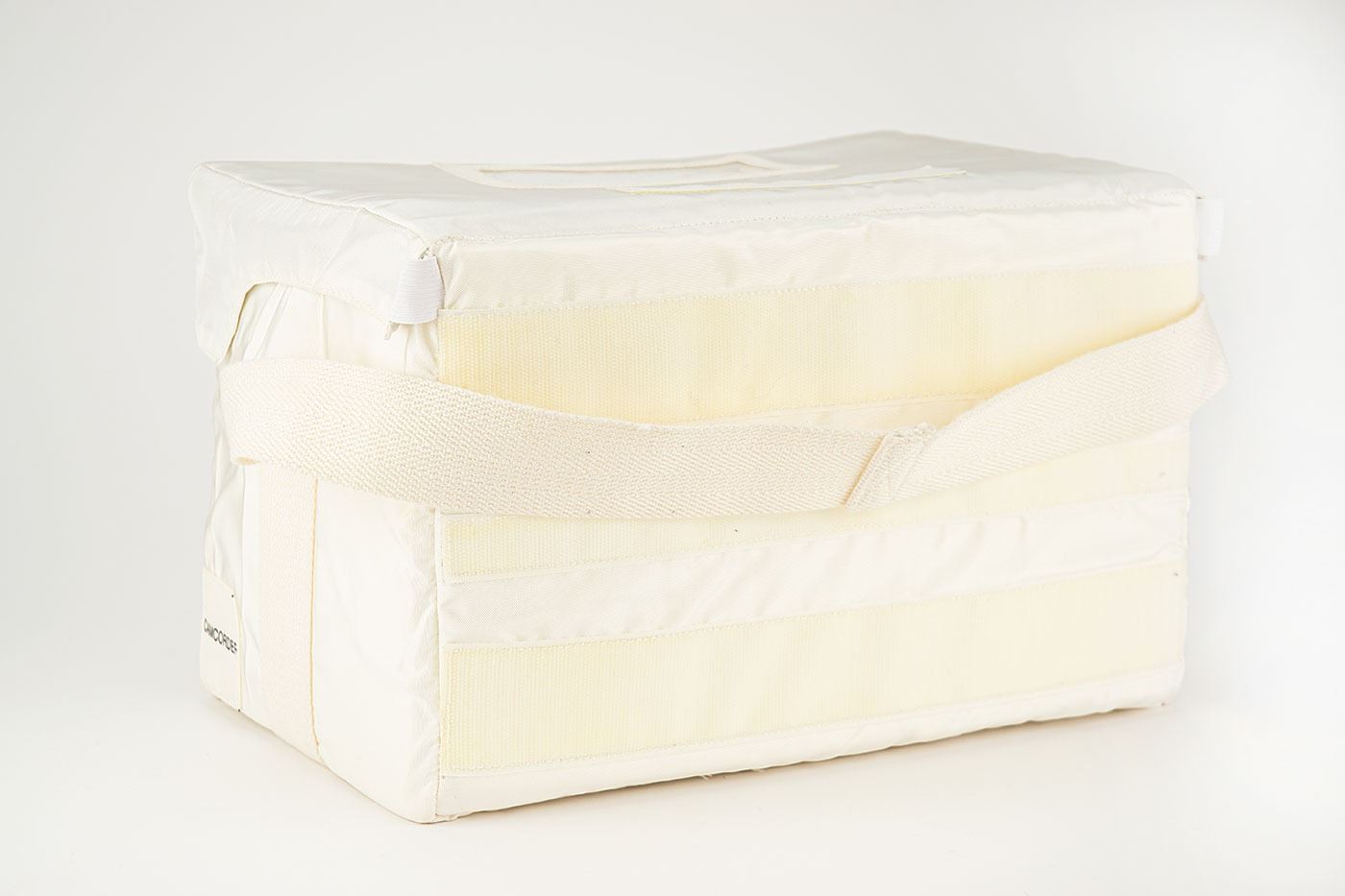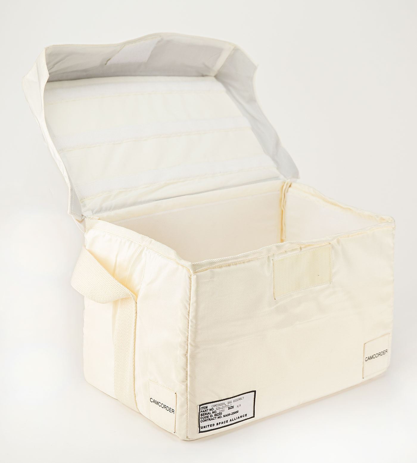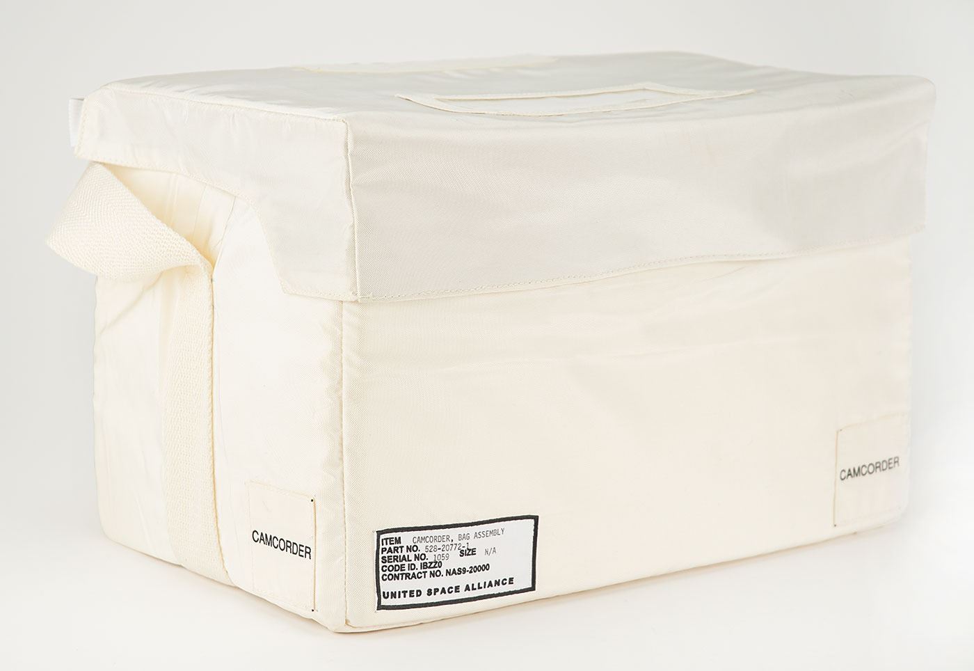Space Shuttle camcorder bag made of white Nomex, measuring 14? x 9? x 9?, bearing a United Space Alliance tag on the front: "Item: Camcorder, Bag Assembly, Part No. 528-20772-1, Serial No. 1059, Size N/A, Code ID IBZZ0, Contract No. NAS9-20000." The bag has square "Camcorder" labels on the front and sides, a see-through pocket on top to hold a list of contents, and three wide Velcro strips on the back. Includes a bottom stiffener (part no. 528-20772-17). In fine condition. The consignor notes that this Class I flight item was purchased as NASA surplus.