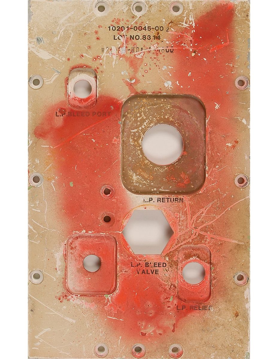Flown shuttle carrier panel flown on one of the shuttle orbiters. Metal plate measures 6 x 9.75, with several stenciled openings which read, “L. P. Bleed Port,” “L. P. Return,” “L. P. Bleed Valve,” and “L. P. Relief.” Panel has also been spray painted red. In very good condition, with expected wear from use.
