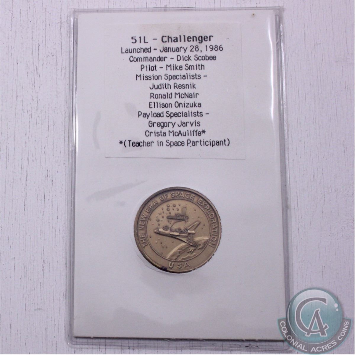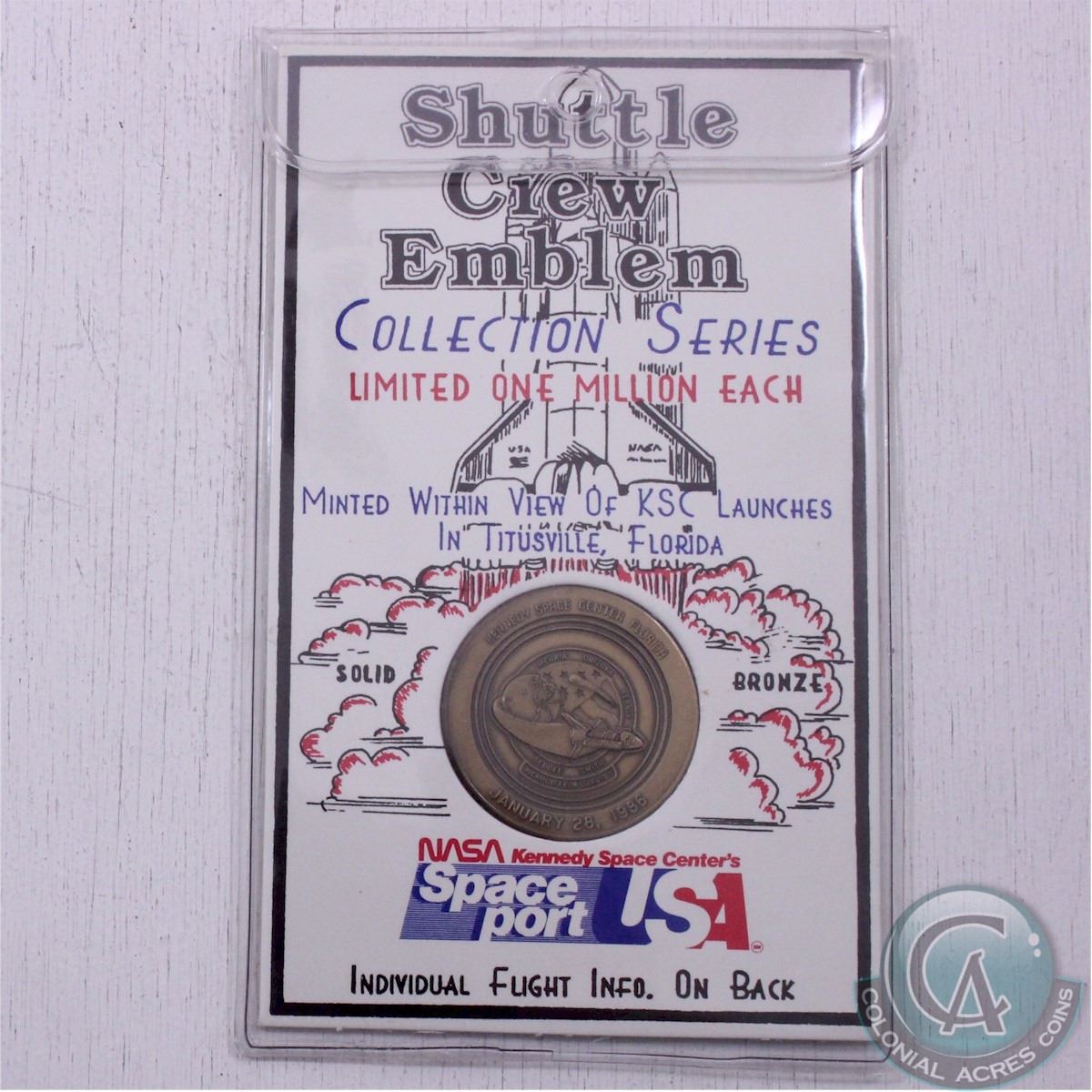 Space Shuttle Challenger Disaster January 28, 1986. This token was issued and sold at the Kennedy Space Center. On the back it lists all 7 crew members that were onboard.