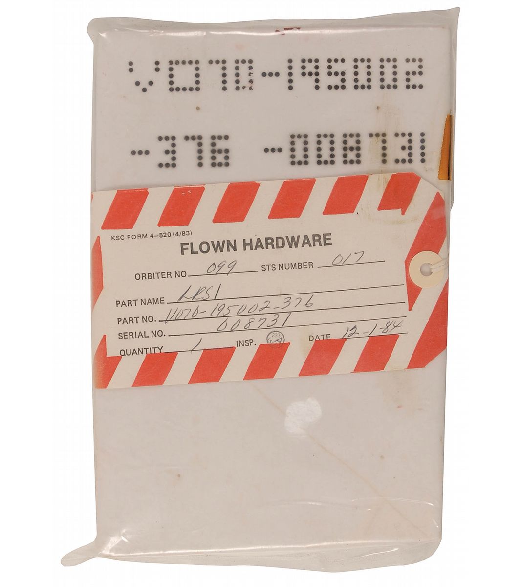 Available to US bidders only. Very rare Challenger-flown LRSI (Low-temperature Reusable Surface Insulation) tile, 5.5 x 8, #V070-195002-376-008731, and stamped on the reverse “099.” Tile was flown on the first six flights of Challenger: STS-6 (maiden voyage), STS-7, 8, 41-B, 41-C, and 41-G, before being replaced. Accompanied by its Flown Hardware tag, filled in by a technician, “Orbiter No. 099, STS Number 17,” (referring to its 17th processing flow), dated December 1, 1984. These tiles would cover the upper wing near the leading edge. They are also used in selected areas of the forward, mid, and aft fuselage, vertical tail, and the OMS/RCS pods. These tiles protect areas where reentry temperatures are below 1,200 °F. The white color is by design and helps to manage heat on orbit when the orbiter is exposed to direct sunlight. These tiles are reusable for up to 100 missions with refurbishment (100 missions is also the design lifetime of each orbiter). White tiles rarely become available for sale. Even more rarely are they available and stamped on the back as 099 ref, to OV-099 original, as this one is.