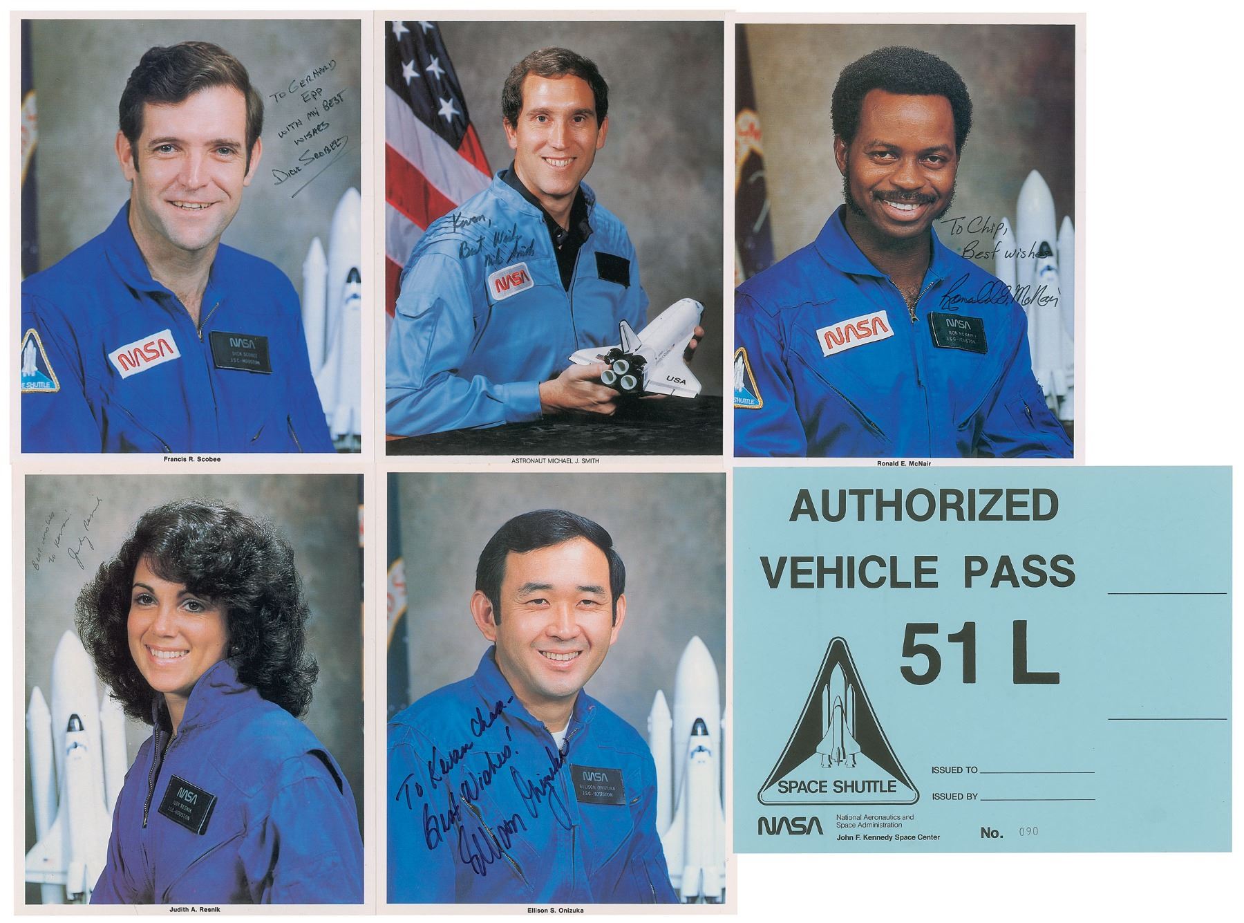 Five official color 8 x 10 NASA lithographs of the crew of the ill-fated Space Shuttle Challenger, individually signed and inscribed in black felt tip: "To Gerhard Epp, with my best wishes, Dick Scobee," "Kevan, Best Wishes, Mike Smith," "To Kevan Chase—Best Wishes! Ellison Onizuka," "Best wishes to Kevan! Judy Resnik," and "To Chip, Best wishes, Ronald E. McNair." In overall fine to very fine condition, with JSA labels affixed to the reverse of the Smith, Onizuka, and Resnik lithographs (only the certificate of authenticity for Smith is present), and a PSA/DNA label affixed to the reverse of McNair (certificate not present). Accompanied by an unissued official vehicle pass for the STS-51-L launch. All five of these astronauts, along with Gregory Jarvis and Christa McAuliffe, were tragically killed in the disastrous launch when the shuttle suffered catastrophic booster failure.