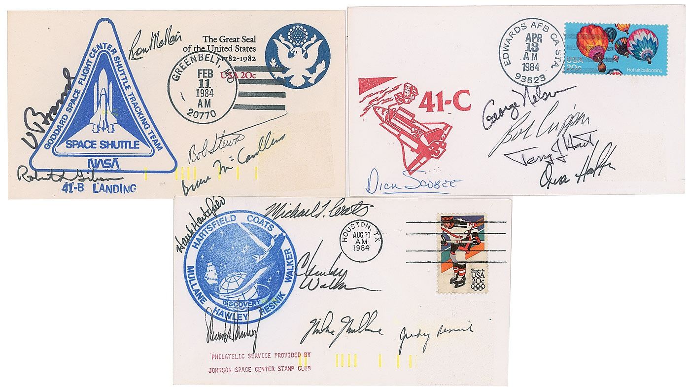 Three crew-signed commemorative covers for Space Shuttle missions, including three astronauts who perished in the STS-51-L Challenger disaster: Dick Scobee, Ron McNair, and Judy Resnik. Missions and signers are: STS-41-B (Ron McNair, Vance Brand, Robert L. Gibson, Bruce McCandless, and Bob Stewart); STS-41-C (Dick Scobee, Bob Crippen, Terry J. Hart, Ox van Hoften, and George Nelson); and STS-41-D (Judy Resnik, Hank Hartsfield, Michael L. Coats, Mike Mullane, Steven Hawley, and Charles Walker). In overall fine condition.
