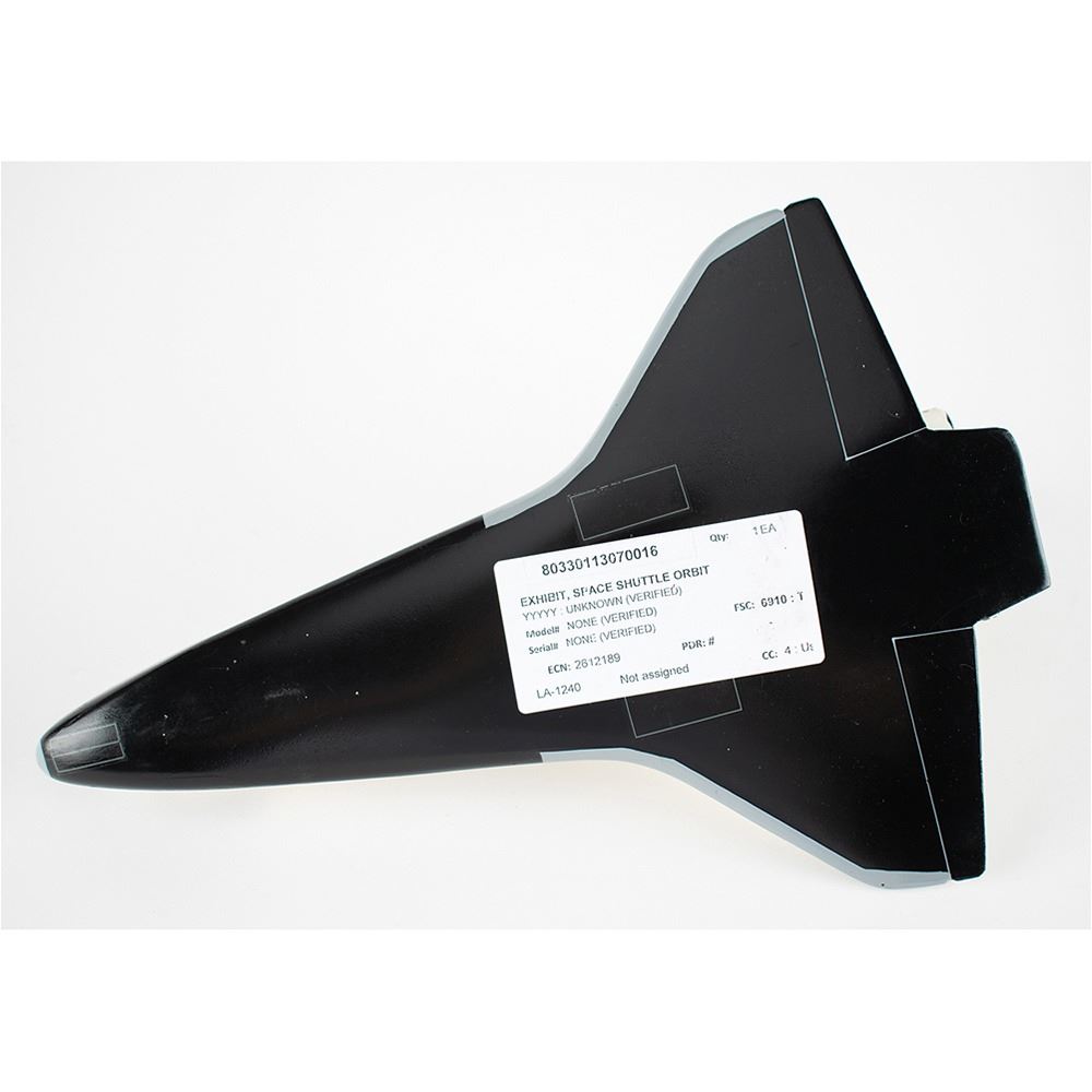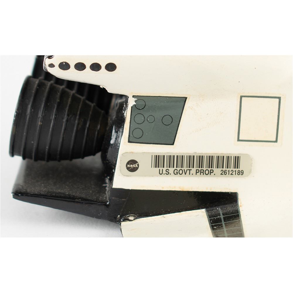 Uncommon NASA-owned 1:100 scale resin display model of the Space Shuttle Columbia (OV-102) orbiter, measuring 14è in length and 9è from wing to wing, with moveable payload bay doors. The rear of the model bears an affixed NASA ‰ÛÏU.S. Govt. Prop‰Û label numbered ‰ÛÏ2612189,‰Û and the underside of the model features an affixed label identifying it as ‰ÛÏExhibit, Space Shuttle Orbit.‰Û In fine condition, with some light wear and small paint cracks, and a repair to the vertical stabilizer.