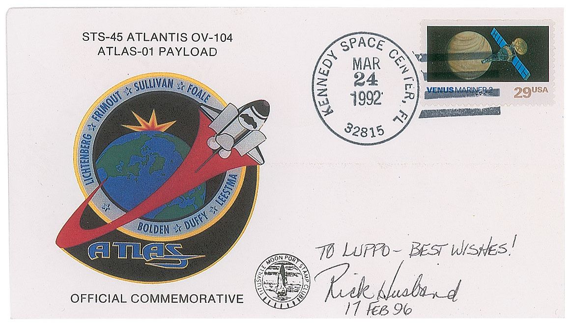 Two items: an official color 8 x 10 NASA lithograph of William C. McCool in his blue flight suit, signed and inscribed in black felt tip, "To Jon—Reach for the stars! Willie McCool, STS-107"; and a launch day cover for STS-45, postmarked at Kennedy Space Center on March 24, 1992, signed and inscribed in black ballpoint, "To Luppo—best wishes! Rick Husband, 17 Feb 96." In overall very good to fine condition, with heavy horizontal crease to the lithograph which passes over McCool's chin. Pilot McCool and Commander Husband were tragically killed in the Space Shuttle Columbia's in-flight break up during reentry on February 1, 2003.