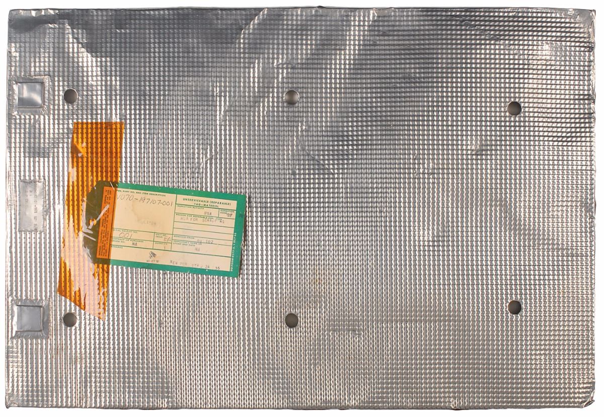 Available to US bidders only. Panel of Multi-Layer Insulation (MLI), 23.25 x 15.75 x .5, bearing an affixed scrap tag identifying it as part number “V070-197107-001,” serial number “001,” removed from OV-102, the Space Shuttle Columbia. Flight history unknown. Scattered soiling to reverse, otherwise fine condition. The Leon Ford Collection.