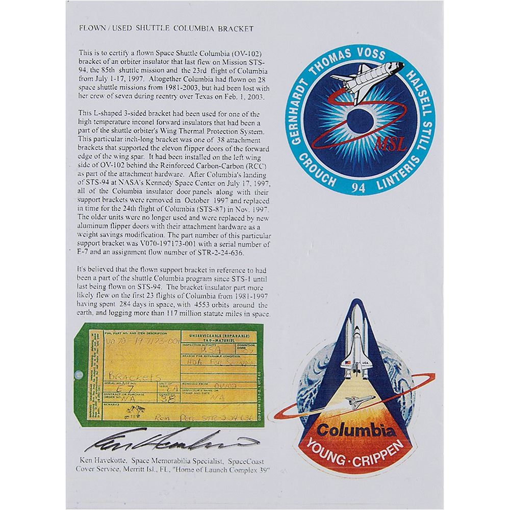 Impressive sheet of flown Inconel forward insulator from the Wing Thermal Protection System of the Space Shuttle Columbia, 16Ë x 23.75Ë x 1Ë, signed and flight-certified in black felt tip by veteran NASA astronaut Don Thomas, who flew on the Columbia on three of his four shuttle missions. Thomas adds above: “An important part of a great spaceship that made by journeys as a Space Shuttle Columbia astronaut possible in 1994 & 1997. Flown Hi-Temp insulator from STS-65, 83, & 94. Over 13.8 million miles in space after 550 Earth orbits in 34+ days!†The lower portion bears two NASA “Critical Space Item†labels and an affixed DD Form marked as follows: “Part No. and Item Description: V070-197111-006, Insulator,†“Serial No. 001,†and “Removed from OV 102.†Includes a signed letter of authenticity from aerospace memorabilia specialist Ken Havekotte, which states: “This particular insulator was a part of the eleven flipper doors of the forward edge of the wing spar. It had been installed on the left wing side of OV-102 behind the…(RCC) attachment hardware. After Columbia’s landing of STS-94 at NASA’s Kennedy Space Center on July 17, 1997, all of the Columbia insulator door panels along with their associated assemblies were removed and replaced in time for the 24th flight of Columbia (STS-87)…It’s believed that the flown insulator panel in reference to had been a part of the shuttle Columbia program since STS-1 until last being flown on STS-94. The silver-colored insulator more likely flew on the first 23 Columbia flights from 1981 to 1997 having spent 236 days in space, with 3800 orbits around the Earth, and logging nearly 100 million statute miles in space.†In fine condition. Accompanied by an official NASA photo of Thomas, who has signed in black felt tip, and a small insulator bracket, 1Ë x .75Ë x .75Ë, attested to being flown on the Space Shuttle Columbia as part of the STS-94 mission, which is joined by a signed certificate of authenticity from Havekotte.