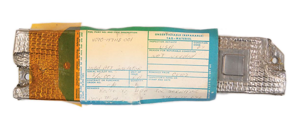 Space Shuttle Orbiter 102 Inboard Aft Insulator, measuring 11 x 2.5, and .5? deep. “Unserviceable (Reparable) Tag” reads “Part no. V070–197118–001, INBD AFT Insulator, S/N 002, removed from OV102.” This insulator was installed and deintegrated from Space Shuttle Columbia.