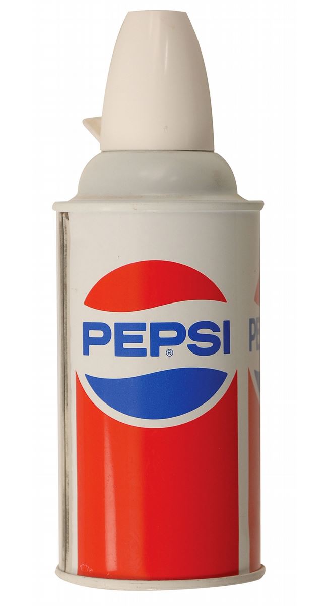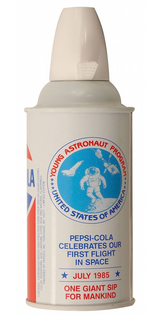 Rare 1985 Space Shuttle Challenger Pepsi can. On one side are the Pepsi and Pepsi-Cola logos. The back reads, "Young Astronaut Program United States of America. Pepsi-Cola celebrates our first flight in space, July 1985. One giant sip for mankind.” Empty can is complete with top. In fine condition. Both Coca-Cola and Pepsi designed special cans (officially the Carbonated Beverage Dispenser Evaluation payload or CBDE) to test packaging and dispensing techniques for use in zero G conditions. The experiment was classified a failure by the shuttle crew, primarily due to the lack of both refrigeration and gravity.