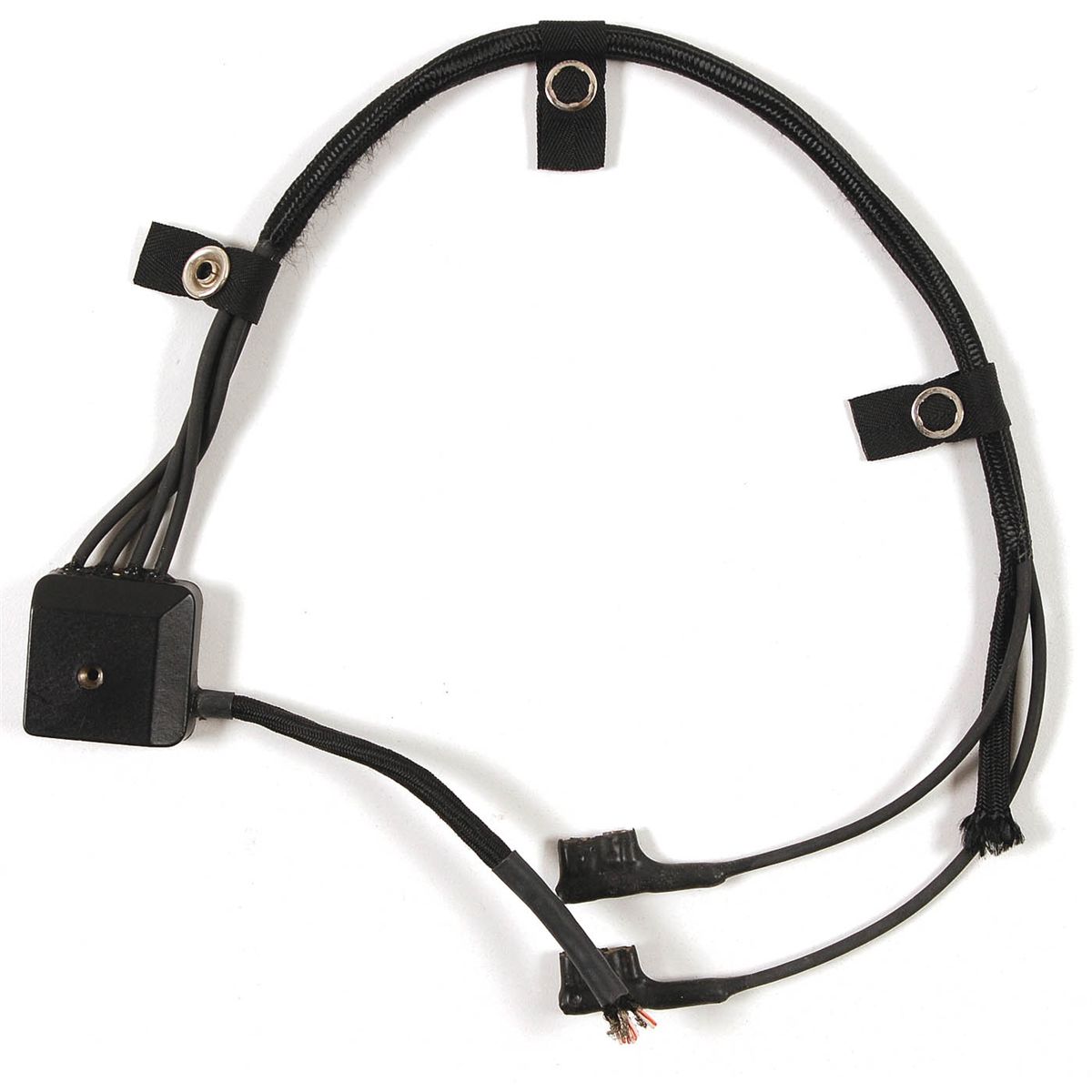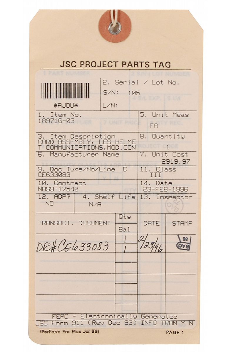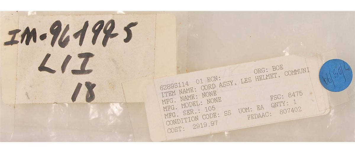 Space Shuttle Cord Assembly, measuring 22" overall. A communications cord for the Launch and Entry Suit (LES) Helmet, with leads at helmet end with amplifier module, and two clips at other end, as well as three snaps along cord. Part number 189716-03, Serial Number 105. Accompanied by its JSC Project parts tag and labeled plastic bag. In very good condition.
