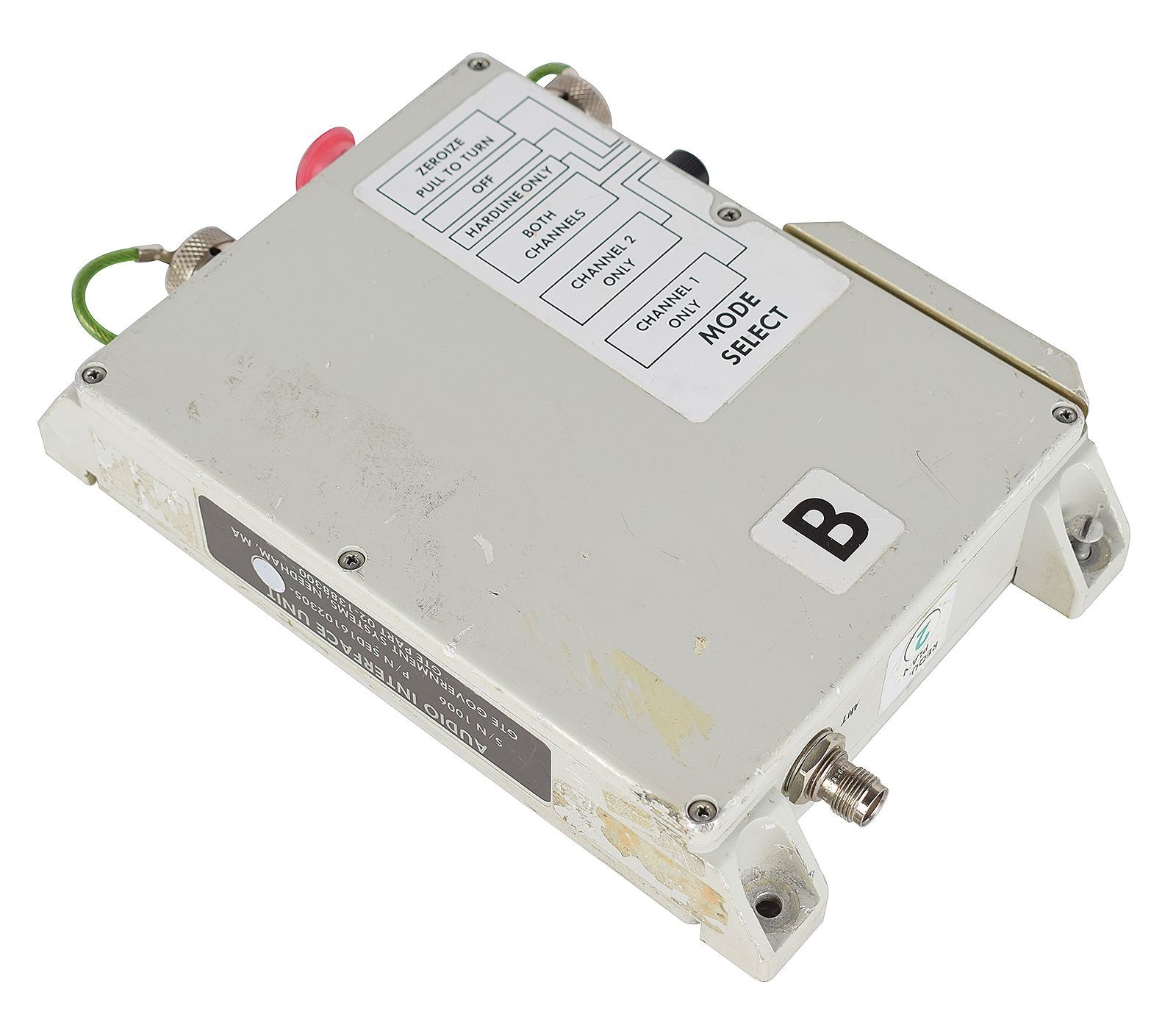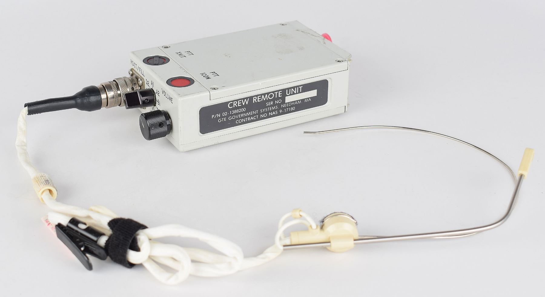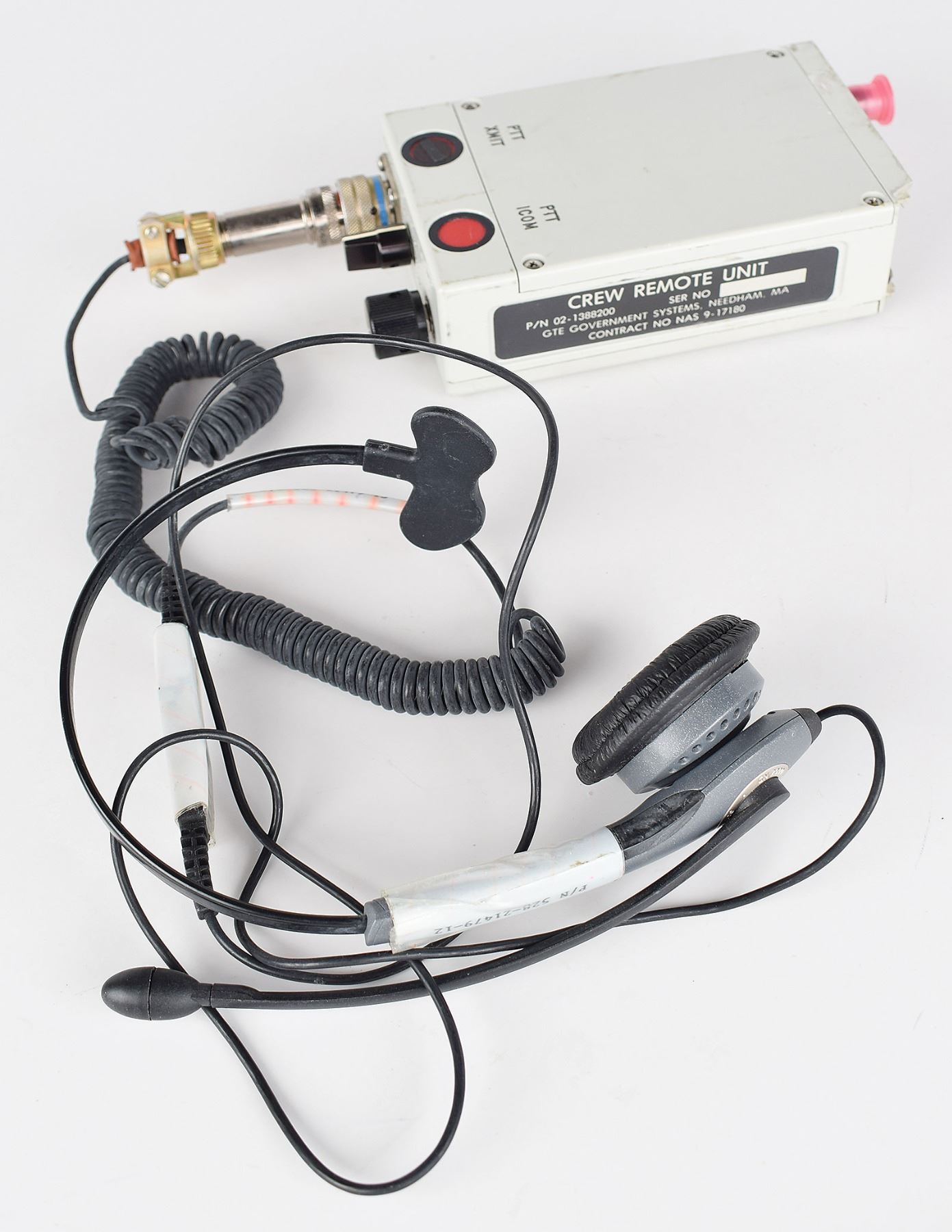 Complete Space Shuttle Crew Remote Communication Kit, featuring three headsets, three communications modules, and one audio interface unit. This type of kit had an encryption feature so that communication among Shuttle astronauts would remain private, in addition to different frequency knobs; these units now have jumper circuit cards where the voice encryption circuit cards would have been installed for classified missions. Two of the communications modules have labels on the side, "Crew Remote Unit, P/N 02-1388200," with no serial numbers specified; the third unit lacks a label. The audio interface unit is labeled: "Audio Interface Unit, S/N SED16102305." Each of the headsets is labeled with part numbers on the cables. In overall very good to fine condition.