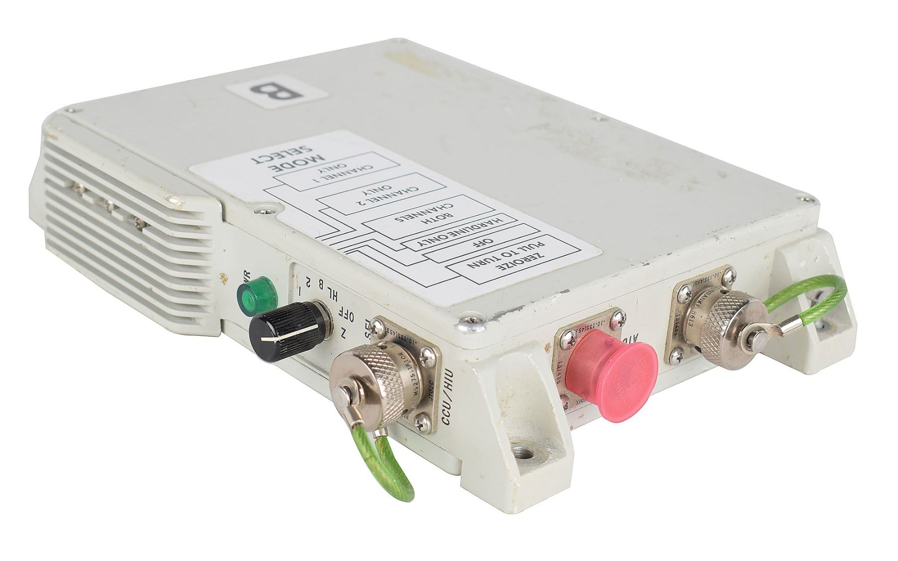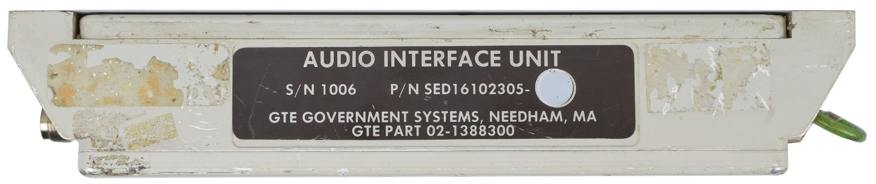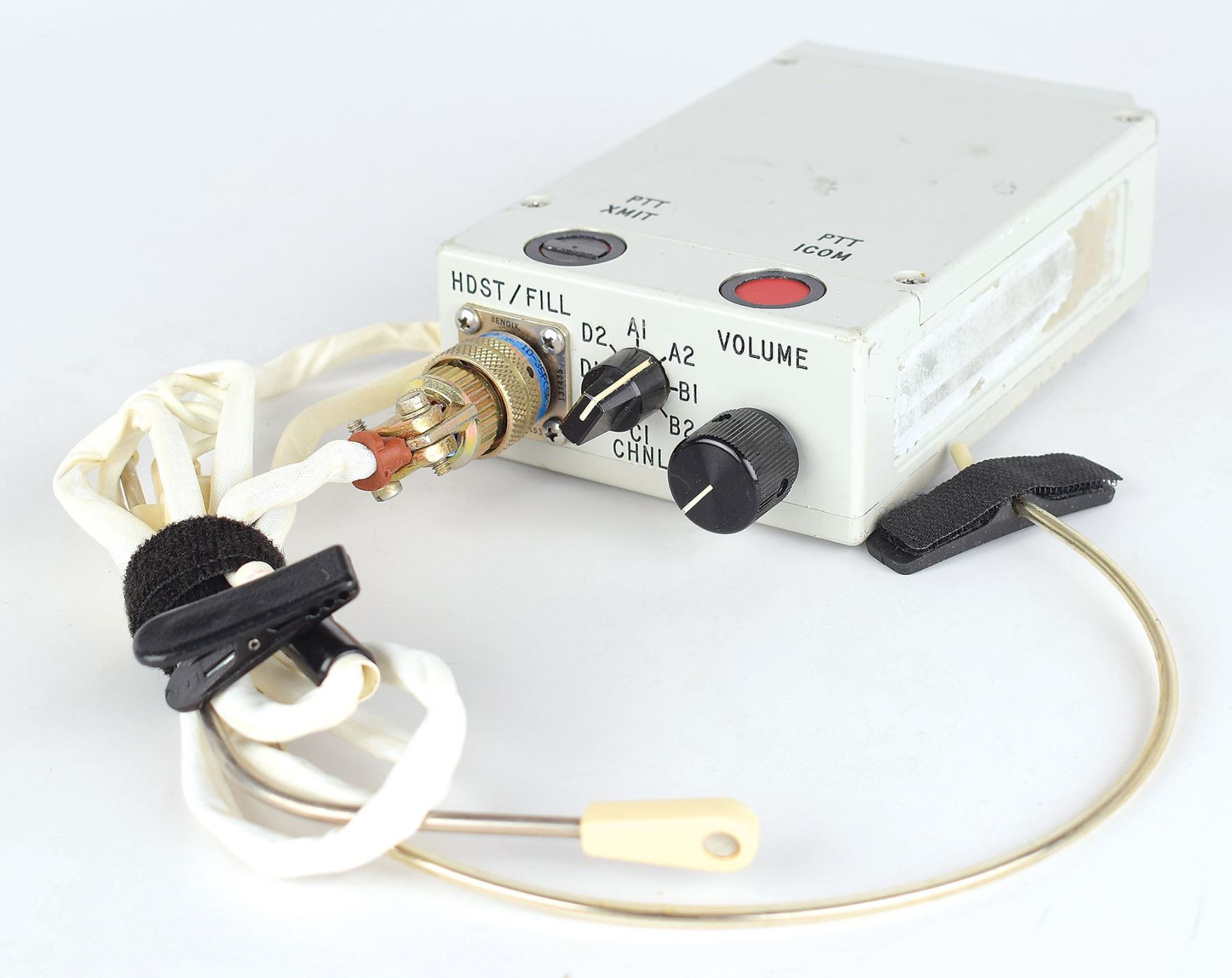 Complete Space Shuttle Crew Remote Communication Kit, featuring three headsets, three communications modules, and one audio interface unit. This type of kit had an encryption feature so that communication among Shuttle astronauts would remain private, in addition to different frequency knobs; these units now have jumper circuit cards where the voice encryption circuit cards would have been installed for classified missions. Two of the communications modules have labels on the side, "Crew Remote Unit, P/N 02-1388200," with no serial numbers specified; the third unit lacks a label. The audio interface unit is labeled: "Audio Interface Unit, S/N SED16102305." Each of the headsets is labeled with part numbers on the cables. In overall very good to fine condition.