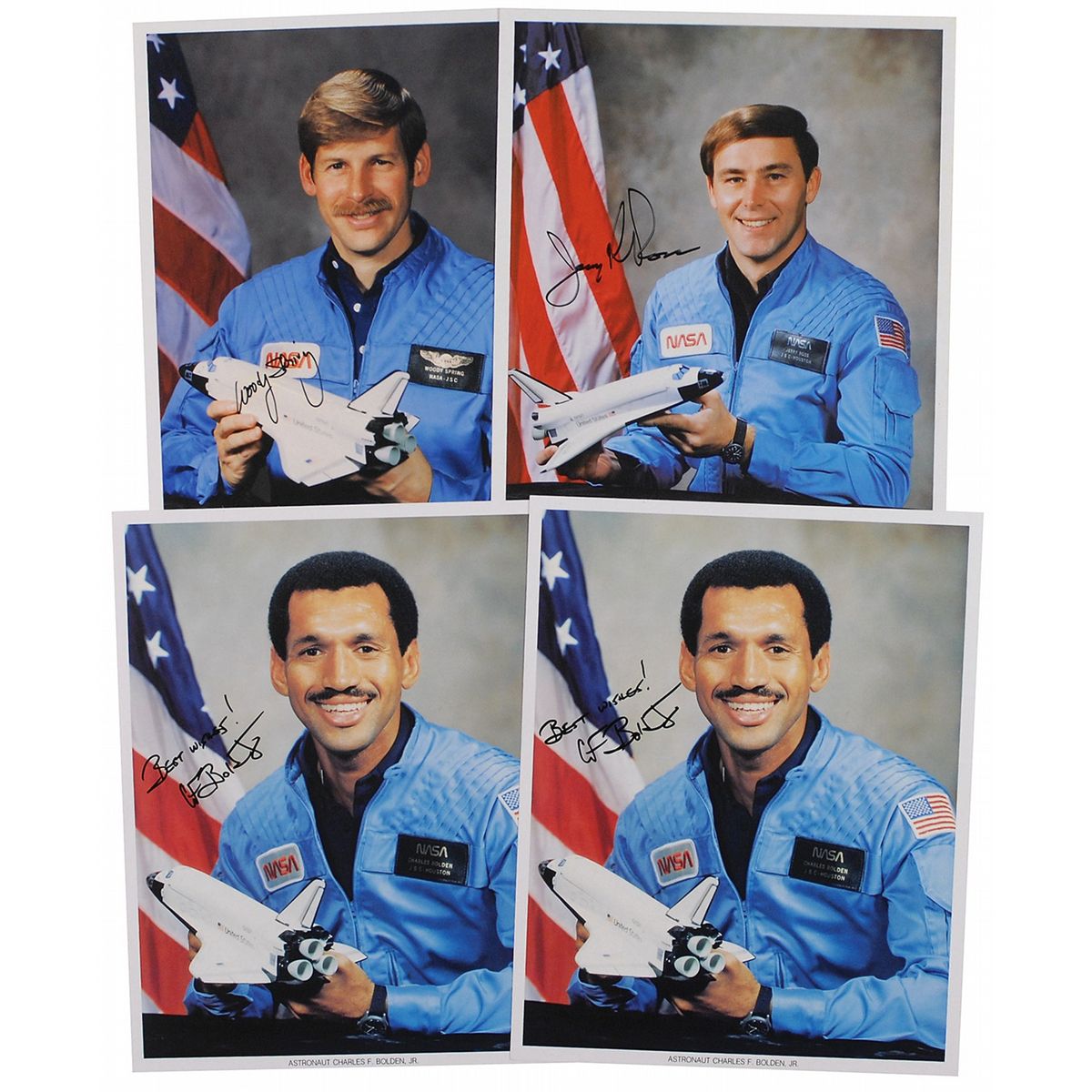 Four color 8 x 10 NASA photos of astronauts posing with a Space Shuttle model, each signed in black felt tip by the subject. Signers are: Charles F. Bolden (2), Jerry L. Ross, and Sherwood C. Spring. In overall fine condition.
