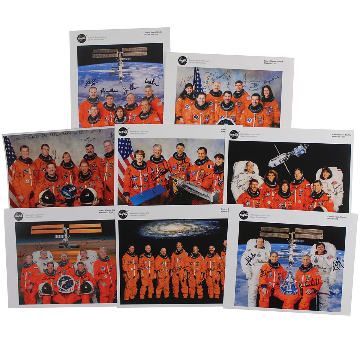 Collection of eight color NASA photos of various shuttle crews, one 8 x 10 and seven 10 x 8, each signed in felt tip by the crew pictured. Missions are: STS-73, 90 (ins), 93, 96, 100, 103, 110, and 111. In fine condition.