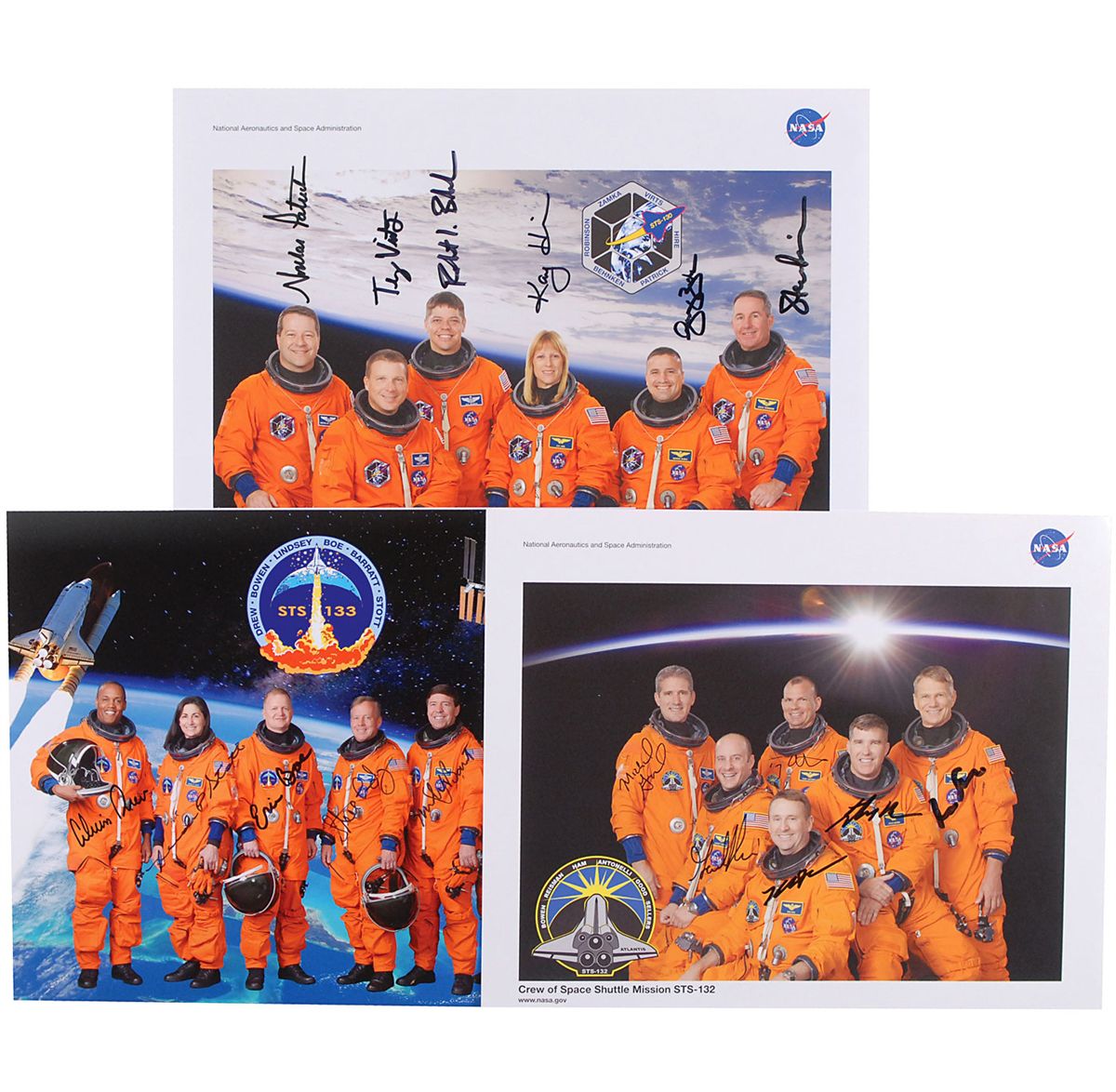 Three color shuttle crew photos, two 10 x 8 and one 8.5 x 11, including two NASA photos, each signed in black ink and felt tip by the complete crews. Missions are STS-130, 132, and 133. In fine condition.