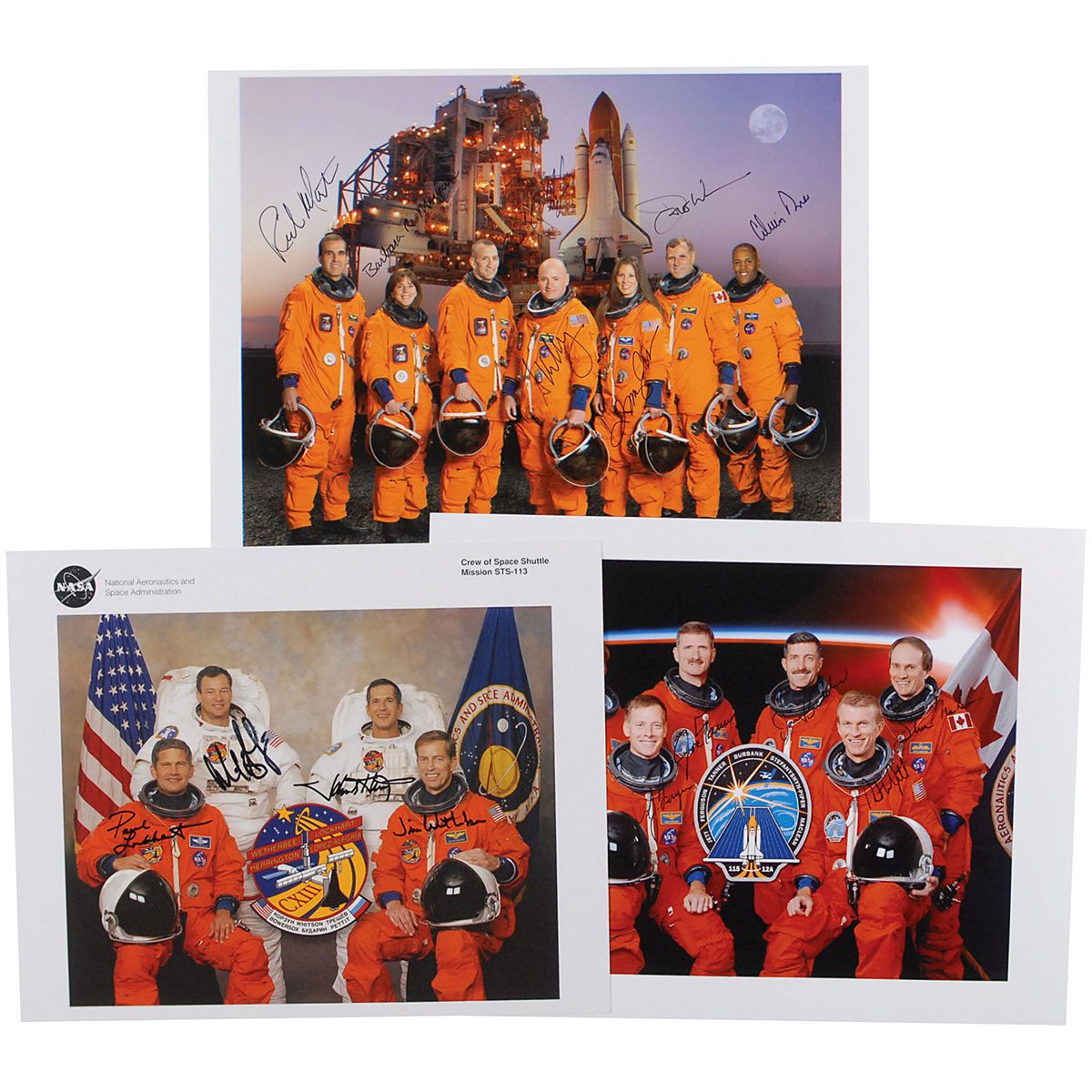 Collection of three color photos of different shuttle crews, one 10 x 8 and two 11 x 8.5, various finishes, including two NASA photos, each signed in felt tip by the crew pictured. Missions are: STS-113, 115, and 118. In fine condition.