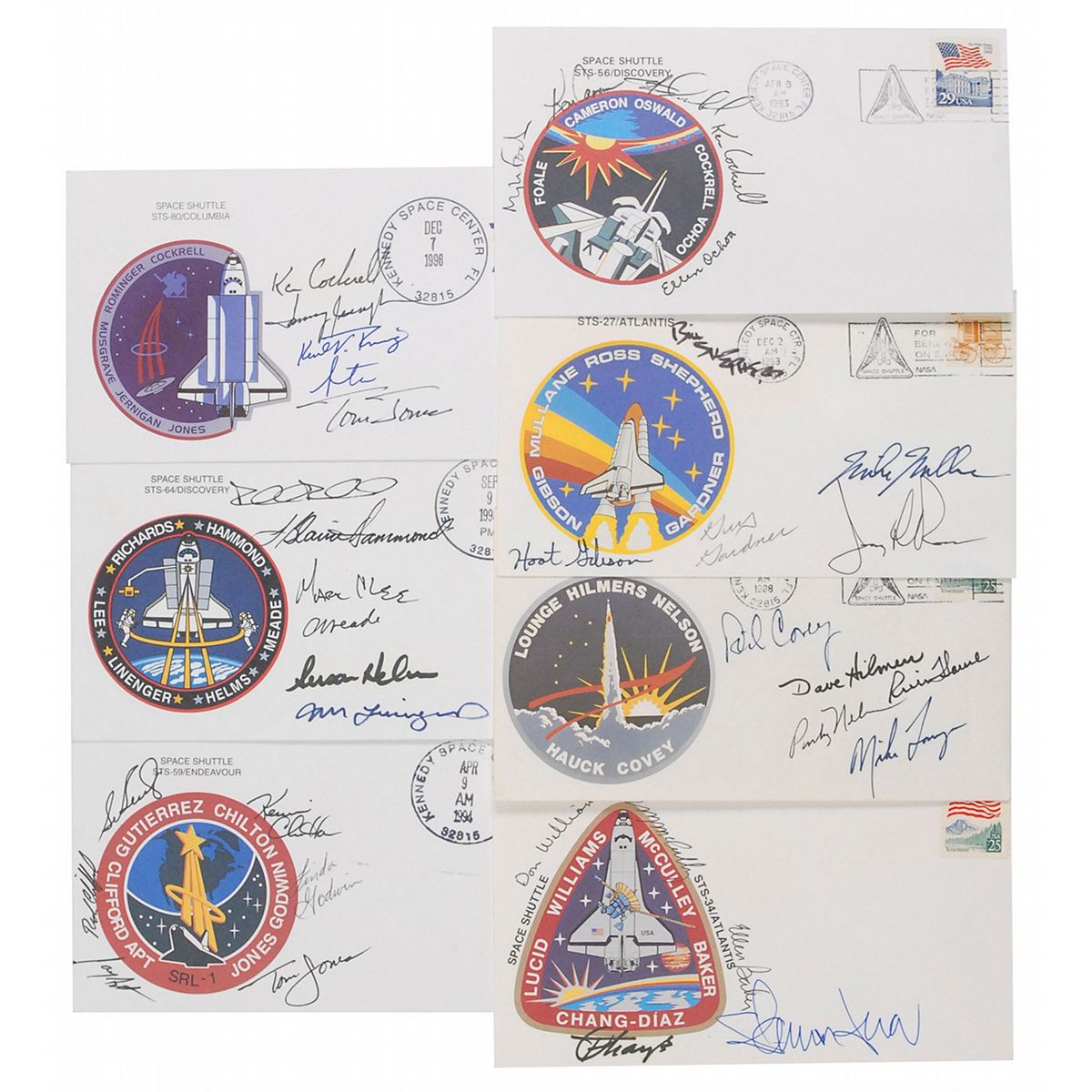 Collection of seven commemorative covers, each with a color cachet of a different mission emblem, and each signed by that mission’s complete crew. Missions are: STS-26, 27, 34, 56, 59, 64, and 80. In fine condition.