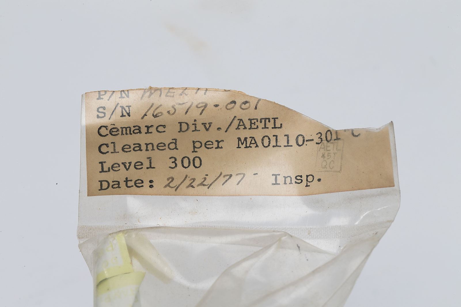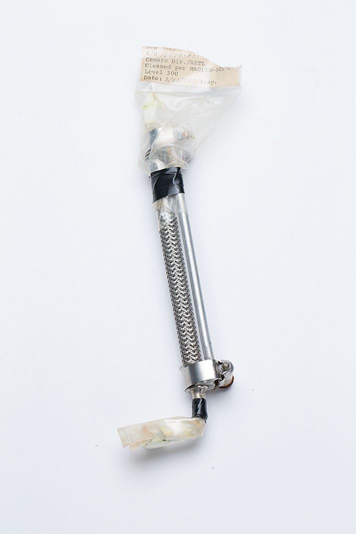 Space Shuttle Cryogenic Hose, featuring a braided hose mounted along a stiff bracket, measuring 9.5? long, with the plastic wrap at the end retaining most of its inspection tag, reading: "P/N ME…S/N 16519-001, Cemarc Div./AETL, Cleaned per MA0110-301 'C', Level 300, Date: 2/22/77 Insp." In fine condition.